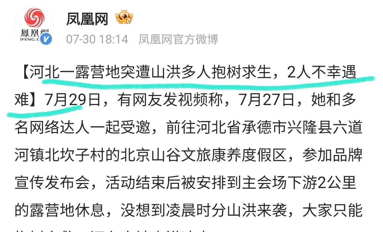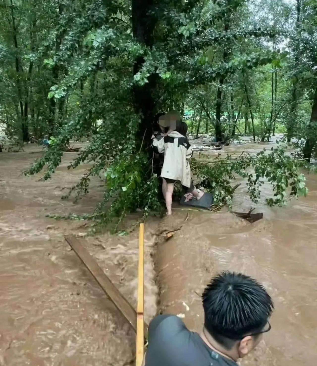 太惨了,出门儿参加主办方的活动,结果把命搭上了。 出门的时候以为是美滋滋的露营。 结果遇到天灾人祸。 这么大的水,还在低洼处,看现场的情况,根本控制不住,被冲走基本上就完蛋了。 而且现在很多人说是去露营,其实一点专业知识储备都没有,根本没有抵御自然灾害和风险的能力。 就像图片上这几位,水都急成这样了,被困的人还有心思在那笑,身边还带着个小孩。 容我说句不好听的,水位但凡变化一点,图上的这几个人都可能有生命危险