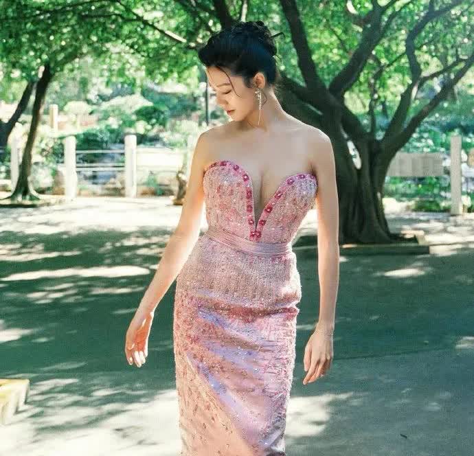 蔡思贝粉色抹胸裙写真,邂逅浪漫夏日,尽显优雅魅力