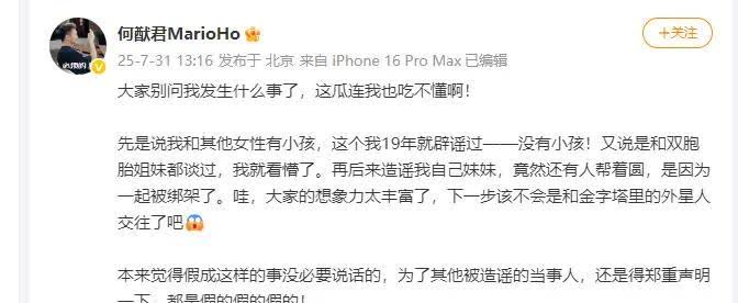 热搜爆了!赌王之子何猷君曾与双胞胎组合BY2中的妹妹孙雨(Yumi)交往期间育有私生子,何猷君回应! 何猷君,1995年1月12日出生, 澳门赌王何鸿燊和四太梁安琪的三儿子, 自己的瓜自己都没有吃懂啊! 关于孩子这一块,直言自己19年都已经澄清过, 现在开始造谣自己妹妹, 直呼网友的想象力太丰富! 并调侃网友下一步要和金字塔里的外星人交往了! 并提醒大众网友,合理吃瓜, 不要看见合影就臆想连篇, 请放尊重点。