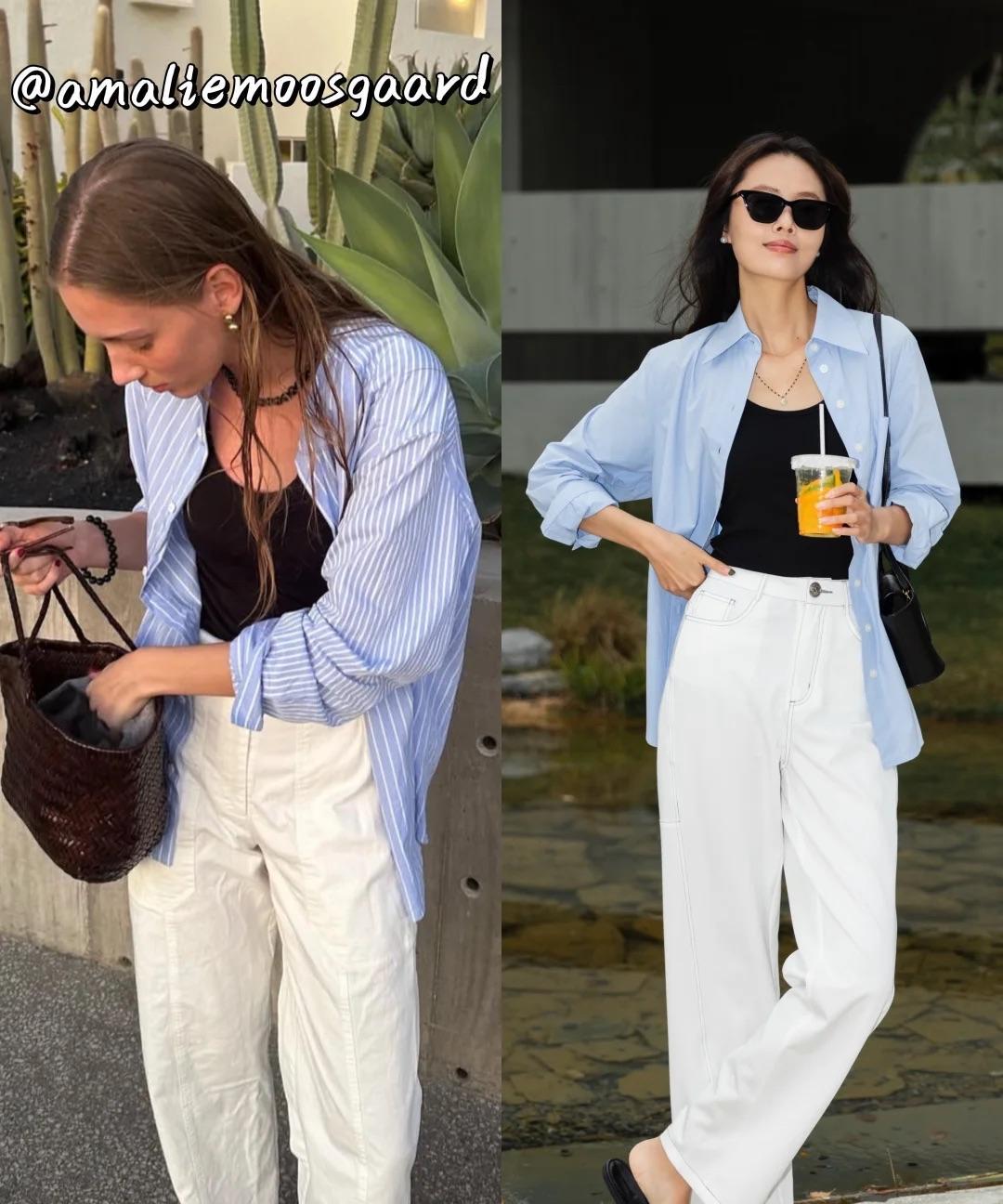 跟着博主学穿搭,解锁衬衫的更多打开方式! 白色衬衫配西装裤,内搭大领口的背心更加的随性洒脱。 下半身还可以选择一条缎面长裙,增加优雅风。日常出街,可以把衬衫当作开衫,里面是细肩带的吊带裙,打造松弛感度假风。 蓝色也很受时髦精们欢迎,配白清新减龄,超好看。