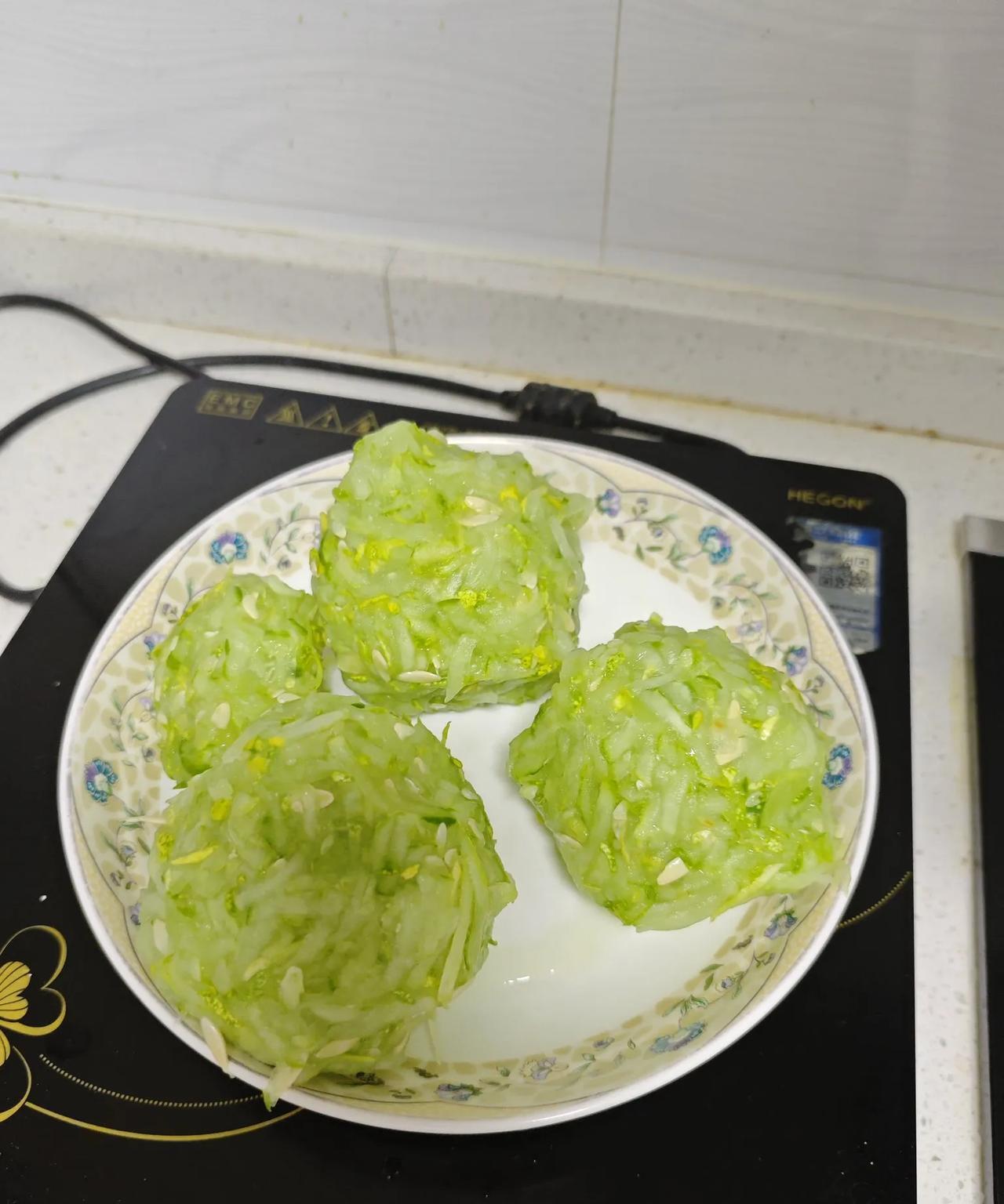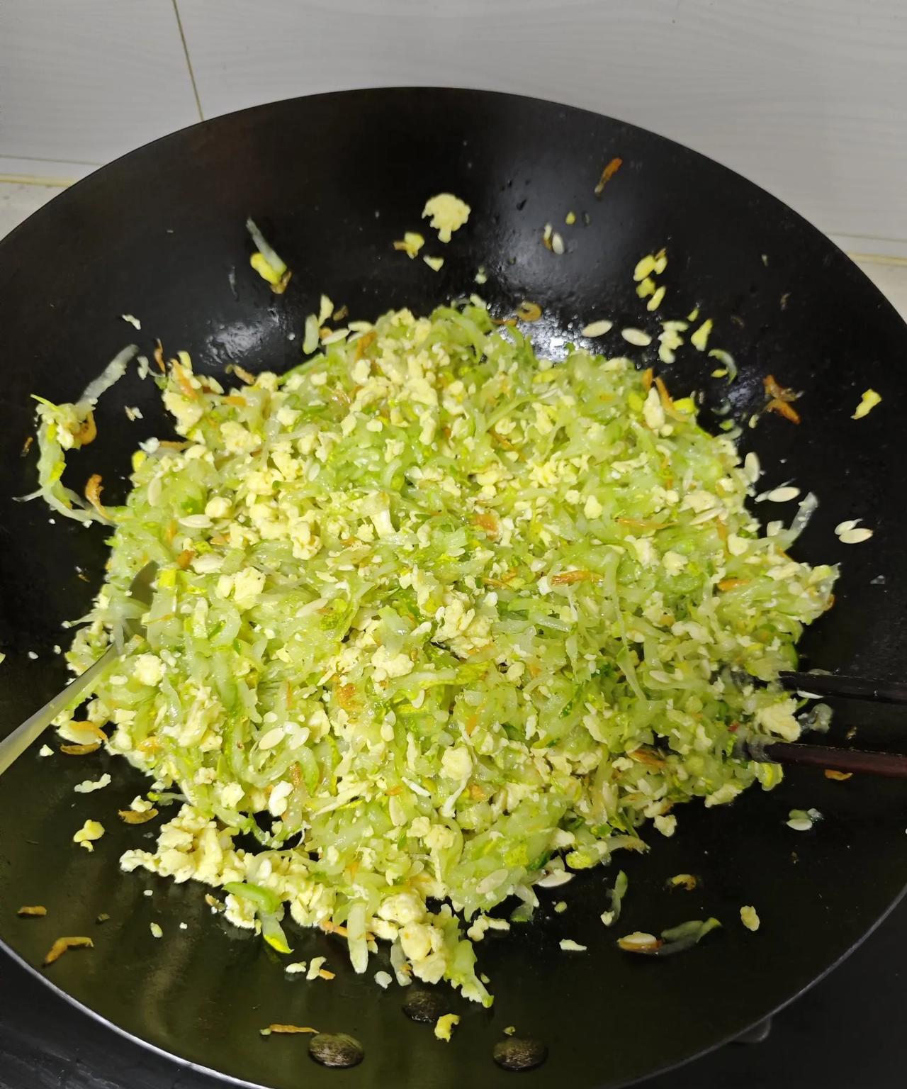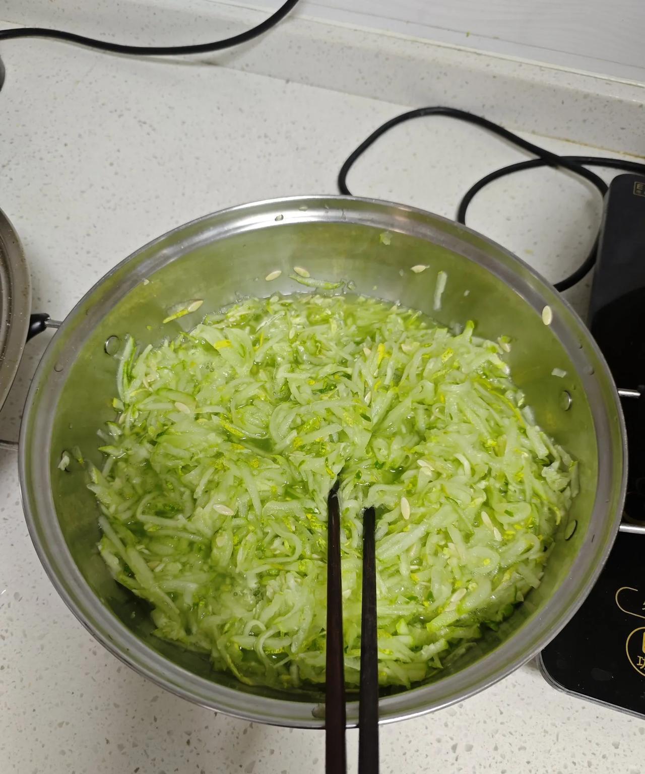 今晚吃黄瓜鸡蛋馅水饺 主材:四个鸡蛋,二斤老黄瓜。 1、黄瓜擦丝用盐煞汤,攥干
