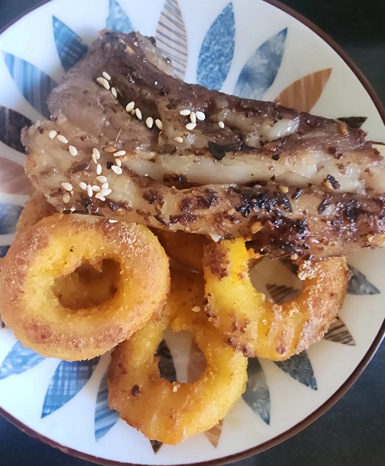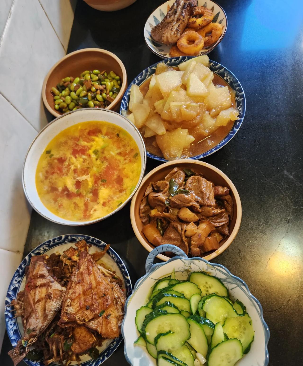 祝氏晚餐:妙煎薄皮鱼,清炒黄瓜,肉沫炒冬瓜,豆耳烧肉,烤羊排,西红柿炒鸡蛋汤