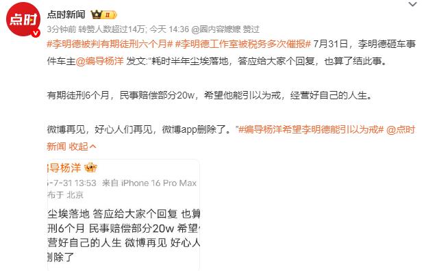 李明德这辈子算是完了,有期徒刑6个月,光这一点以后后代就不能入编了。 以后李明德再出来已经是素人一个了,别说是在娱乐圈发展,在任何一个领域估计别人都会嫌弃他了,你说要是真的自己冤枉,可以通过法律解决,自己逞什么英雄,说白了李明德的脑子还是不够用啊!很多网友也表示他应得的,也有网友感到可惜。称李明德是动了某些人的蛋糕,加之他年轻轻狂,所以被人耍了。 当然还有不少网友调侃李明德现实生活的戏比剧里还精彩。不管怎么样,希望李明德以后好好经营自己的人生,虽然自己不能照耀别人了,可是要是好好生活还是能够活的很精彩。