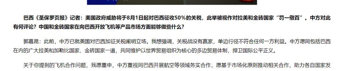 美国抡出 50% 关税大棒,巴西咋一点不慌? 本该是美国施压的狠招,反倒被卢拉政府拿出反制法案怼回来。 这反常的背后藏着蹊跷:美国关税净捡软的捏,核心商品全豁免;而中国敞开市场的承诺刚落地,金砖兄弟更是抱团撑腰,这场博弈,早已不是巴西单打独斗那么简单。 面对着美国50% 的关税,巴西这边早有准备,刚通过的反制法案,就像手里有了尚方宝剑,不光要到 WTO 告状,还放话要对等加税。 最关键的是,他们不是一个人在战斗 —— 金砖国家早就递过橄榄枝,中国更是明明白白说了:敞开市场,帮巴西把损失的生意补回来。 中国这话可不是随口说说,咱们和巴西早就能用本币结算,人民币直接换雷亚尔,不用看美元脸色,等于给贸易上了双保险。 巴西的飞机制造业,以前大半靠美国市场,现在中国航空公司正谈新订单;咖啡、矿产这些农产品,中国超市货架等着补货呢。 你看美国这税加得就挺虚,说是加税,却把巴西最赚钱的买卖都放过去了 —— 民用飞机、生铁、木浆这些核心出口品压根没碰。 其实美国这么做,心里也打鼓:真给巴西飞机加税,美国航空公司买一架就得多花 900 万,最后还不是老百姓机票涨价买单? 更别说巴西握着全球大半的铌资源,这东西是全球高科技产业都无法离开的材料,真惹急了巴西,美国芯片厂都得停工。 其实美国这点心思谁都明白:想拿捏巴西,又怕自己疼,毕竟美国超市里一半的咖啡来自巴西,没了巴西的铌,美国隐形战机都造不出来。 这种打一巴掌又怕对方还手的操作,巴西怎么可能怕? 现在金砖国家就像抱团取暖的兄弟,你帮我卖飞机,我帮你稳市场,连算账都绕开美元。 美国想靠关税耍威风,到头来发现人家早有退路。就像中国承诺的那样,大家一起把多边贸易的盘子做大,谁还在乎那点单边制裁的威胁? 这事儿看得挺清楚:不是巴西胆子变大了,是全球生意的规矩变了。 以前美国挥挥关税大棒就能吓住人,现在有了金砖这样的朋友圈,大家互通有无、互相撑腰,单边制裁那套早就不好使了。