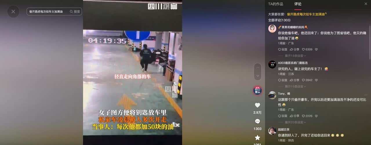 这还是个讲究人!云南红河,女子为了省事,将车停在地下车库后,都会把钥匙留在车中,谁曾想,女子开了一段时间车子后发现,车子油量居然没一点下降,出于好奇,女子向物业调取了监控,结果让女子大吃一惊! 在云南红河的一个小区里,赵女士有个习惯,那就是总爱把车钥匙忘在车里。她想着这样挺方便,却没想到发现了一个奇怪的事儿:车子的油耗好像永远不变。好奇之下,她查了监控,结果真是让人哭笑不得。 原来啊,赵女士记性不太好,老忘拔车钥匙,时间一长,这就成了她的一个习惯。她觉得小区里有监控,车子肯定安全。可是最近,她发现不管怎么开,油表就像定住了一样,一点不动。她心里犯嘀咕,就去找物业看了监控。这不看不知道,一看吓一跳——每天晚上,都有个小伙子偷偷摸摸地上车,打火就开走,几个小时后又神不知鬼不觉地送回来。更好笑的是,这小伙子每次用完车,还给赵女士的车加50块钱的油。 警察一来查,小伙子就招了。他说自己有天看到赵女士的车钥匙没拔,就起了坏心思,想着偷偷开出去玩玩也不会被发现。为了让自己心里好受点,他还每次都加点油当“补偿”。可是,这事儿最终还是被赵女士给发现了。面对这么个“讲究”的“偷车贼”,赵女士想了想,车子没坏,还白得了几次油,最后也就原谅他了。赵女士大方地原谅了对方,但这件事也给大家提了个醒:得时刻注意安全,不能马虎。不管心里打着什么“好心”的旗号,随便拿别人的东西那可是违法的。
