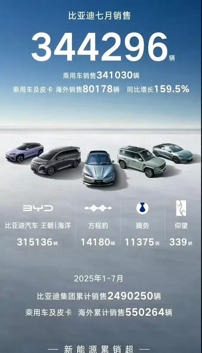 比亚迪7月销量344296辆,1-7月累计近250万辆。 整个七月对于比亚迪太不