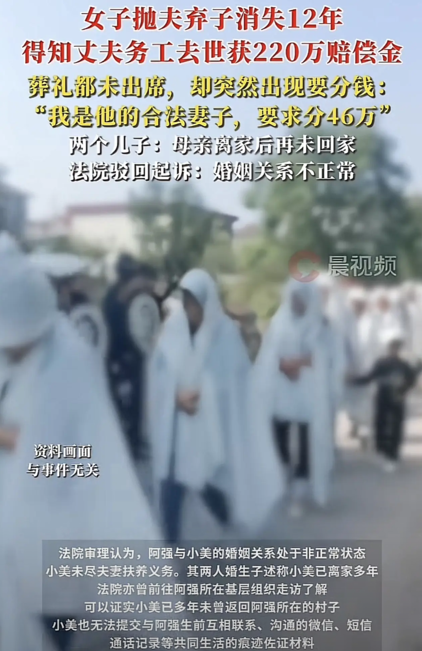 “太不要脸!”安徽,一女子抛弃5岁和7岁的儿子离家出走,再也没回过家,丈夫独自拉扯2个孩子。12年后,丈夫打工时意外去世,单位赔偿了220万,岂料,女子却突然出现,竟要从孩子手里分46万赔偿金!孩子怒斥:你连葬礼都没参加,没资格分!法院这样判!
