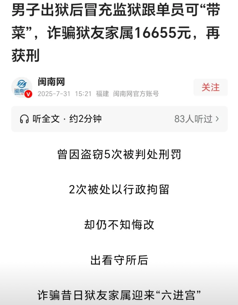 江西赣州,一男子因盗窃5次入狱,在服刑期间没有改过自新,反而惦记狱友的家底。在一次闲聊中狱友提了句家里条件不错,他眼珠一转,悄悄记下狱友妻子的联系方式。他前脚刚出去,后脚就拨通了电话,称可以帮狱友带菜改善伙食,狱友妻子信以为真,男子竟多次从对方手里套走16655元。只是这发财梦没做多久,就东窗事发,男子因此6进宫。