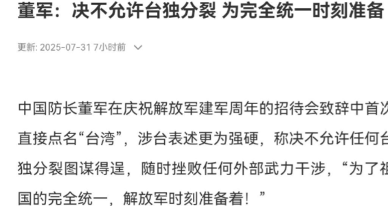 外媒都嗅出不一样的味儿了 —— 中国对台的表态,明显硬气起来了! 根据联合早报的报道,8 月 1 日解放军建军周年招待会上,董军防长的致辞里,头一回直接点了台湾的名,这跟去年建军节招待会那会儿比,可是大不一样。