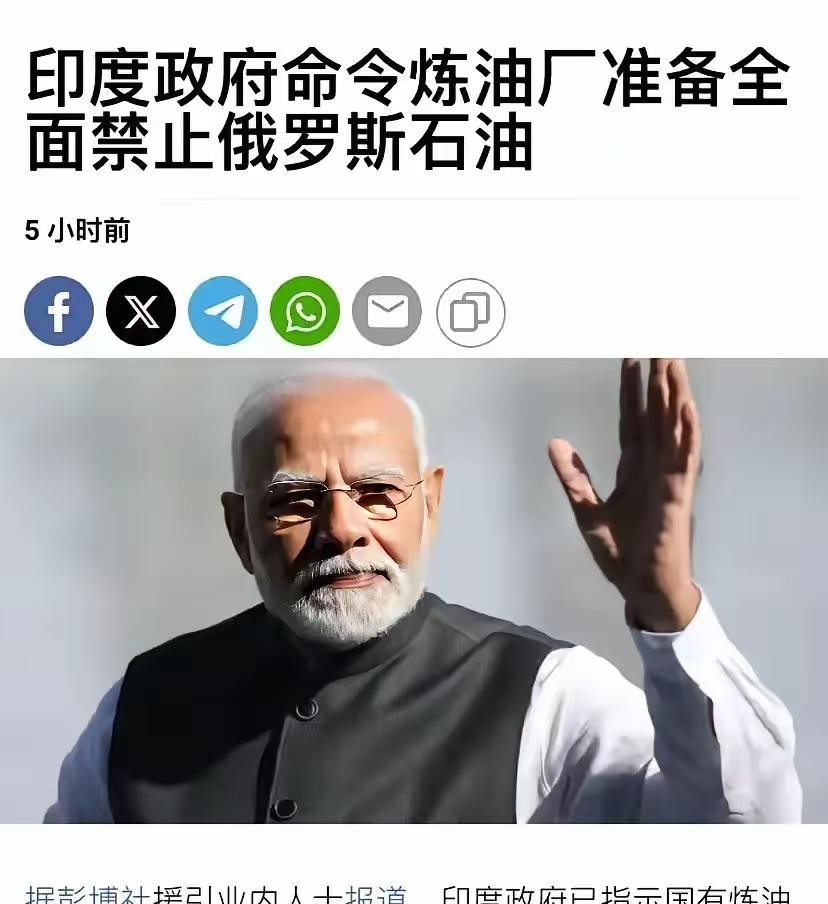 当地时间周五下午,特朗普在下班去打高尔夫球前接受记者采访,当问到为什么取消对印度的惩罚性关税时,特朗普回答到“印度将不再向俄罗斯购买石油了”。 此外,多家外媒报道印度炼油厂接到印度政府指令,接下来不购买俄油。 综上,印度不再购买俄油基本上是确定的。 第一,这事开了个危险的先例,买油纯属各国自己能源策略,美国以关税为武器干涉它国内政,而且还成功了。 第二,这事对印度直接损失很大,一方面,买不了便宜的折扣俄油了,当不了二道贩子卖欧洲赚钱了。另一方面,俄油的缺口从哪里补,特朗普肯定会要求印度买美国油,这又是一大笔钱。 第三,这事对印度长远影响更是难以估量。因为这次因为关税威胁,不买俄油了。下次与巴基斯坦起冲突了,美国再拿关税威胁怎么办??目前看,特朗普明显更青睐巴基斯坦一点。 综上,大国坚持独立自主非常重要,还是我们中国硬气,直截了当在中美第三次谈判的怼回美国,“购买哪国能源是中国主权问题”,美国“管不着”。 #头号创作者激励计划#