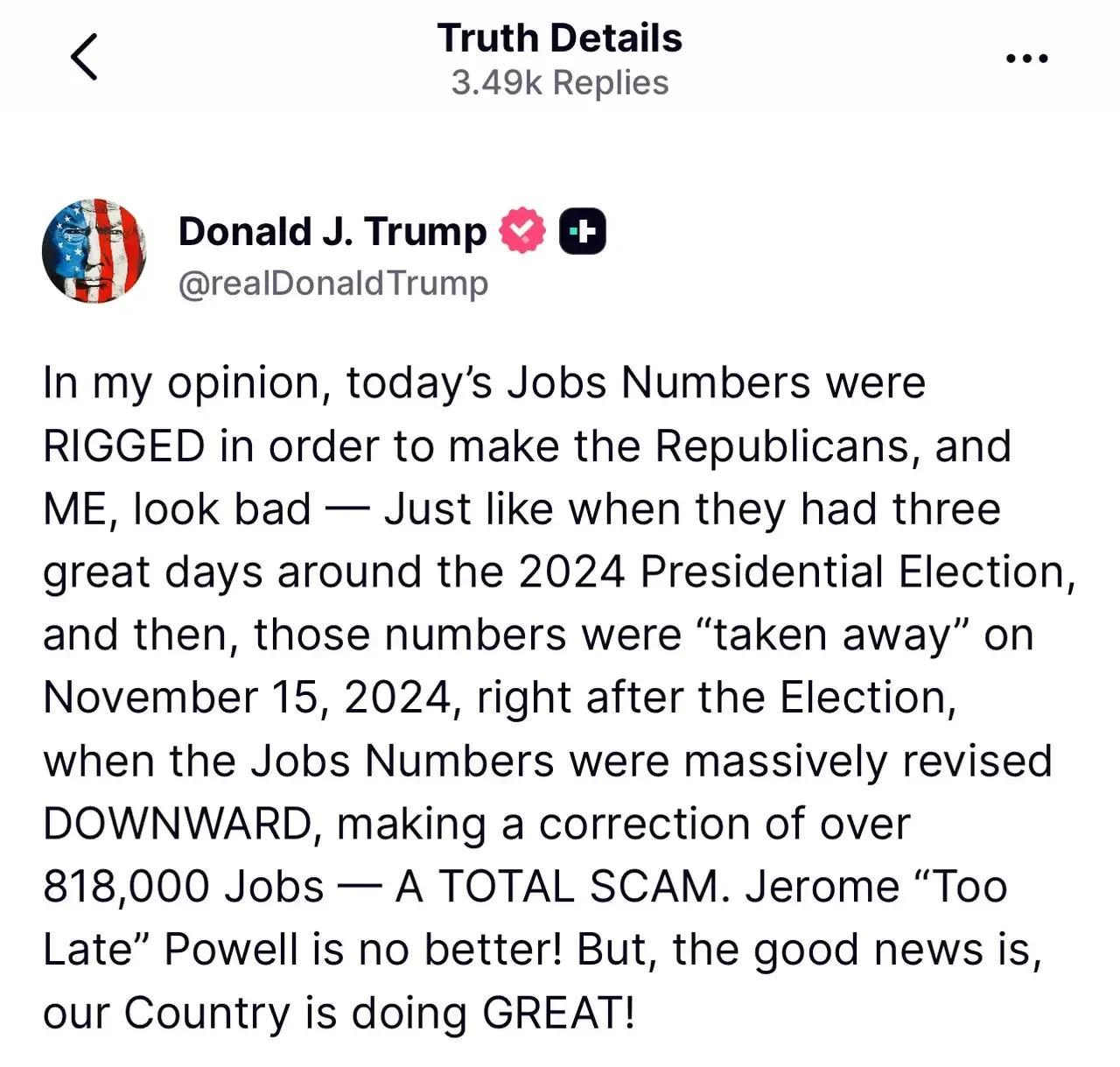 就业数据不好,公开拿统计局局长开刀,这事估计只有川普才干得出来!漂亮国的全球信任度快被川普掏空了。 8月1日,川普解雇了劳工统计局(BLS)局长,原因是BLS公布的最新就业数据增长大幅放缓,特朗普指责数据“被操纵”,不利于共和党。 该报告显示,7月新增就业岗位仅为73,000个,远低于预期,同时5月和6月的数据也遭到大幅下修,合计减少了258,000个岗位。 川普发文为自己找了充分的理由:2024年总统大选前后那几天,他们曾公布过连续三天的好数据,(大选之后)又“撤回”了那些数字,这完全是个骗局。 有分析指出,川普的此次行动是杀鸡儆猴,是其打击技术官僚强化政治控制的深入推进。川普持续向全体联邦官员传递了一个重要信号:一切都得听我的,否则就滚蛋! 美国经济数据长期被视为全球经济的“黄金标准”,尤其是就业数据对全球金融市场影响巨大! 解职消息公布后,美股三大指数集体下跌,道指单日蒸发超1万亿美元市值。 川普公开干预政府统计部门和美联储,正在快速摧毁相关机构的独立性和权威性,美国全球信任大厦摇摇欲坠!