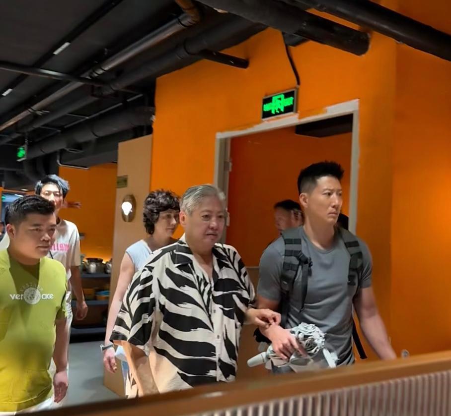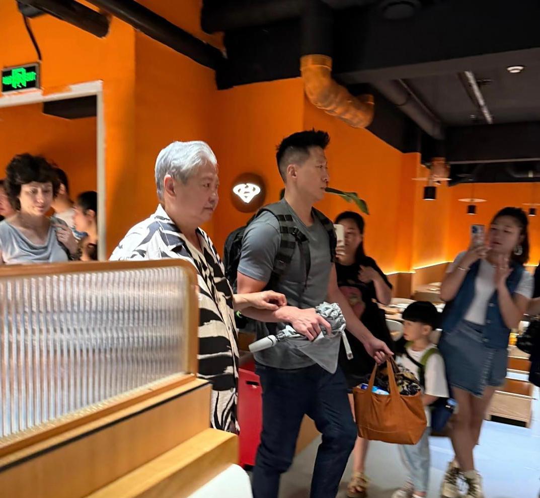 75岁洪金宝和家人在汕头吃牛肉火锅,三儿子洪天照搀扶着他走路,洪天照实在是太帅了