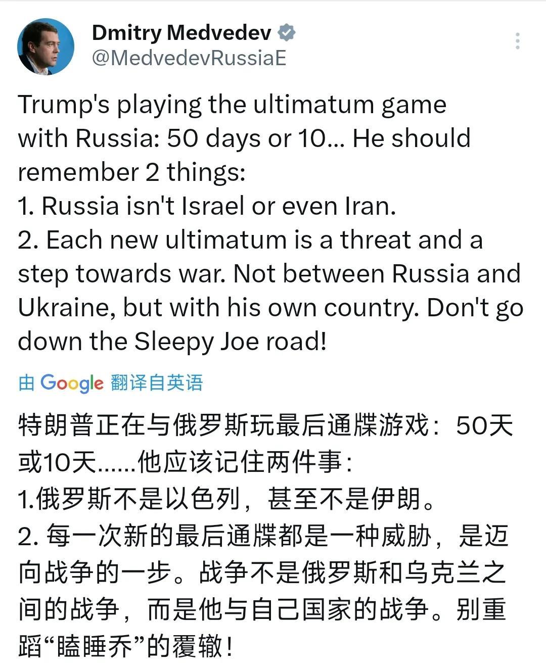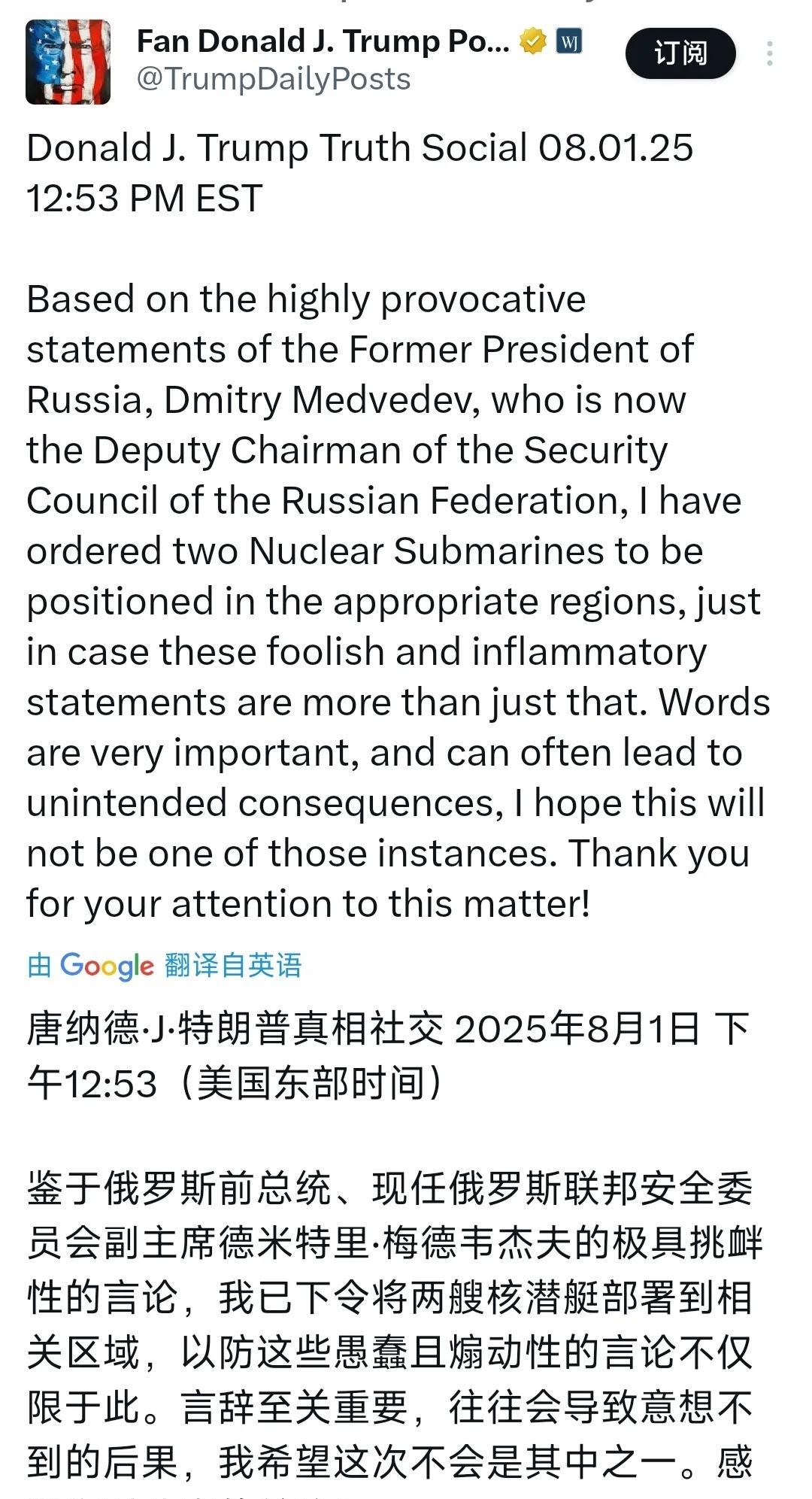 特朗普今天(北京时间8月2日)写道:“鉴于俄罗斯前总统、现任俄罗斯联邦安全委员会副主席德米特里·梅德韦杰夫的极具挑衅性的言论,我已下令将两艘核潜艇部署到相关区域,以防这些愚蠢且煽动性的言论不仅限于此。言辞至关重要,往往会导致意想不到的后果,我希望这次不会是其中之一。感谢您对此事的关注!”