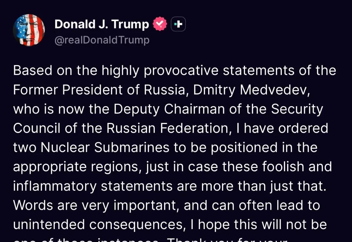 8月2早晨看点,特朗普回应梅德韦杰夫核言论并表示,我们已经做好了核的准备!并将两艘核潜艇部署到相应区域! 特朗普在接受采访时表示,“必须为核做好准备”,“说到核……我们已经做好了充分准备” 就在几个小时前 特朗普在社交媒体发文表示,鉴于俄罗斯前总统、现任俄罗斯联邦安全委员会副主席德米特里·梅德韦杰夫的极具挑衅性的言论,我已下令将两艘核潜艇部署到相应区域,以防这些愚蠢且煽动性的言论不仅限于此。言辞至关重要,往往会导致意想不到的后果,我希望这次不会是其中之一。感谢您对此事的关注! 之前前俄罗斯总统梅德韦杰夫告诫特朗普总统,要记住“传说中的‘死亡之手’有多危险”。 “死亡之手”是一种系统,如果俄罗斯领导层被摧毁,就会自动发射核导弹。 综合来看,特朗普和梅德韦杰夫两个人的言论不断升级,现在都上升到了核言论!如果俄罗斯真的想对美国使用核武器就不会公布,同样如果美国真的打算对俄罗斯使用核武器也不会宣布。我认为要么就是两人吵架吵出了新高度,要么就是两人在表演给全球看。 我在梅德韦杰夫发表对特朗普的核言论的时候,我就说过。特朗普表示制裁俄罗斯无非就是两种情况。一种情况就是和俄罗斯演戏给欧洲和全球看,美国通过俄罗斯购买大量的廉价石油和天然气然后转卖给全球;另一种就是美国的要制裁俄罗斯,通过极限施压的手段迫使美国屈服,从而获得俄罗斯廉价的石油和天然气。总之特朗普的目的就是为了俄罗斯廉价的石油和天然气。 对于以上事件你有什么看法,欢迎评论区留言探讨,关注我,获取更多国际精彩资讯!