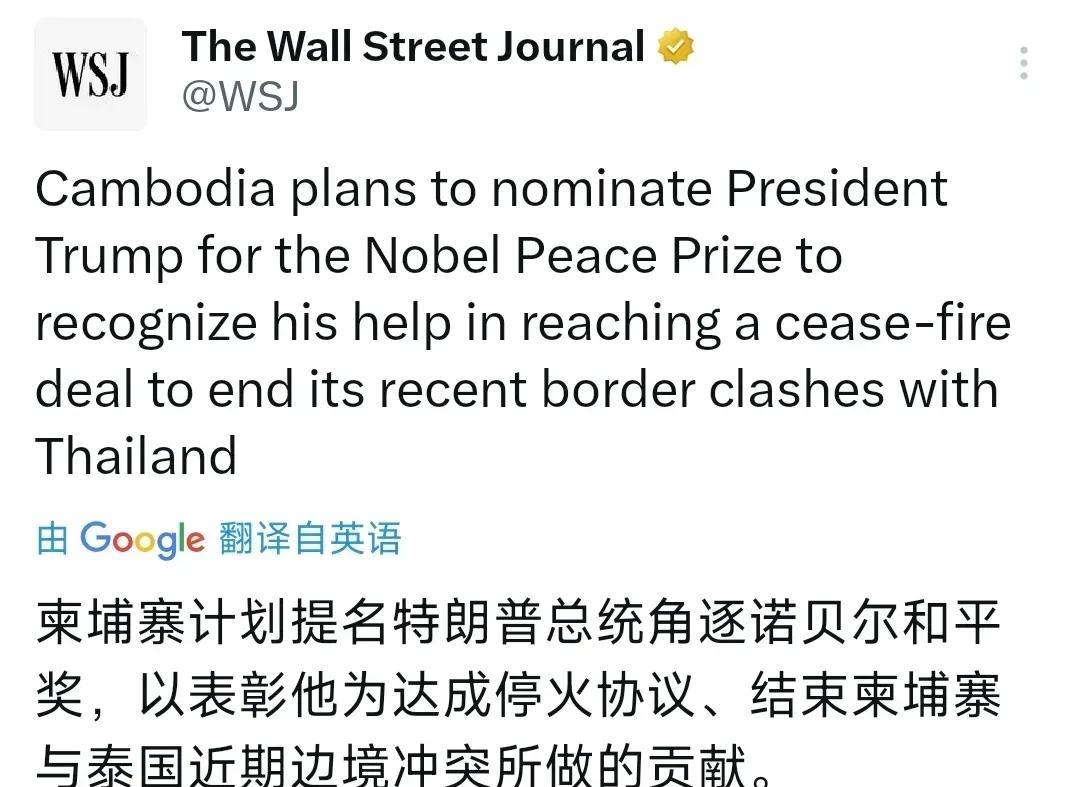 来自外媒8月1日的消息说,柬埔寨已经准备提名美国总统竞争诺贝尔和平奖。 外媒强调,这是柬埔寨为了感谢美国促成其与泰国停火。 可以说,听到这样的消息,美国总统显然是高兴了。因为对于他而言,不但要让美国在全世界具备领导地位,其个人的地位也要得到巩固。而提名为诺贝尔和平奖,这是很多人一直期待却又得不到的。 美国总统近期表示,他担任总统以来短短的一段时期,已经促成了多达6场战争,所以他个人认为获得此奖是实至名归。 而柬埔寨这一提名,对其没什么付出,却能让美国总统满意,不得不说是件好事。