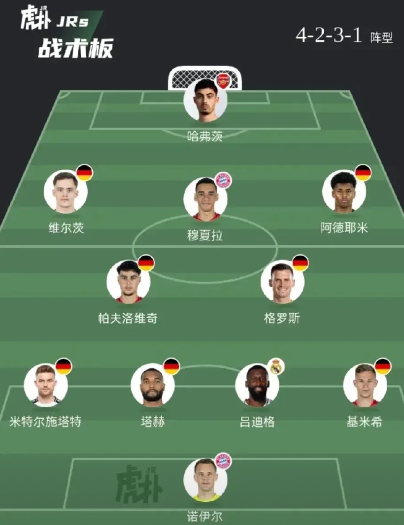 这应该就是德国队26年世界杯的首发阵容了吧?搞不好诺伊尔要重回国家队踢主力。 听说纳子要让基米希回6号位,那右边后卫的位置不是更弱了吗? 我个人意见,中场还是格罗斯搭档泡芙或者施蒂勒。基米希还是踢右后卫比较合适。 希望纳子能早点醒悟,德国现在的边后卫已经出不了拉姆这种世界级的球员了。总不能两个边都被爆吧? 至于中锋的位置其实也挺尴尬的,就看沃尔特马德和哈弗茨下赛季谁的发挥更好了。