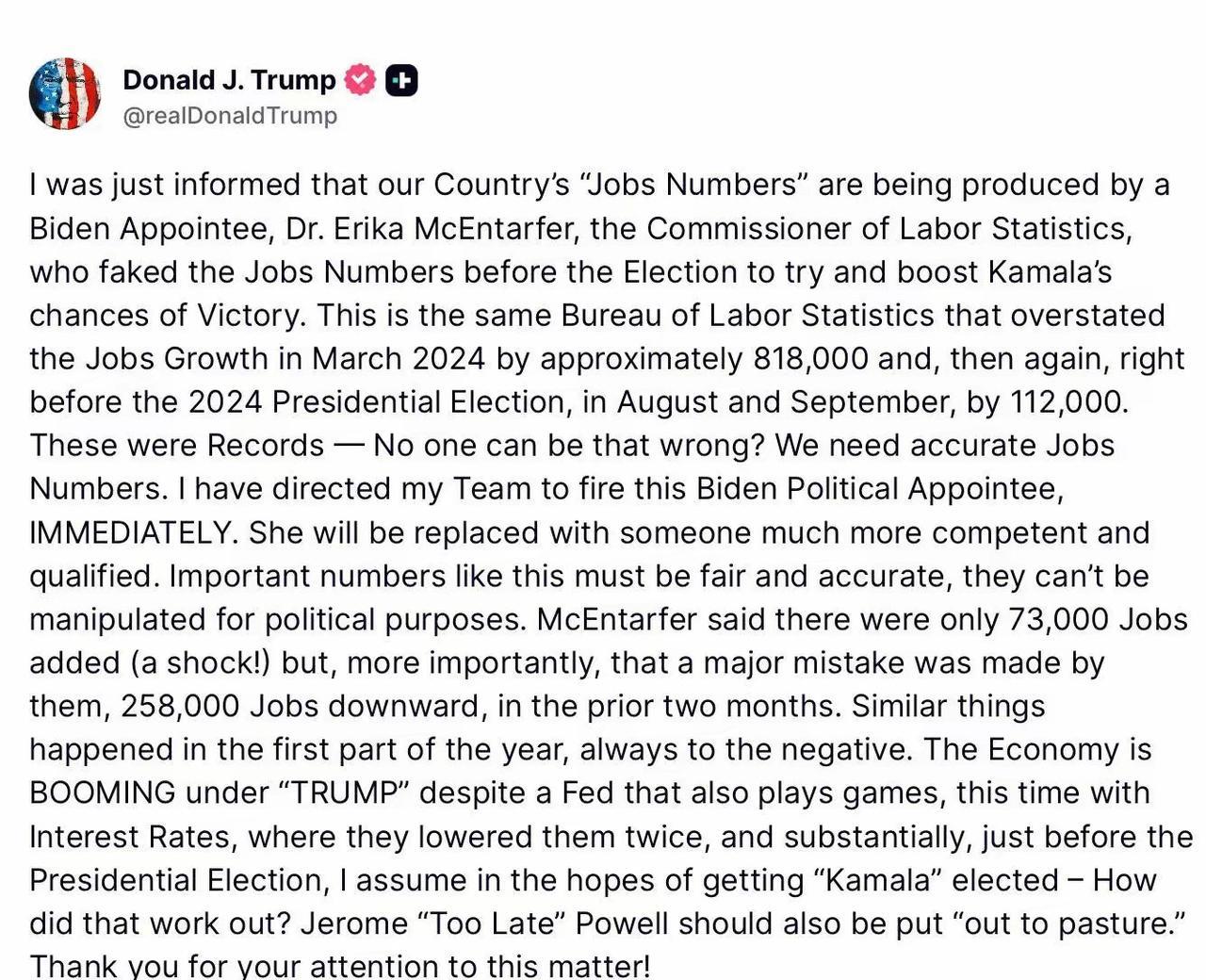 #头号创作者激励计划#特朗普开除了统计局局长,说他是民主党内奸 昨天美国统计局数据出来了,非农就业数据5、6月份分别从14.4万和14.7万直接降到了1.9万与1.4万,也就是说美国统计局直接承认自己此前数据超级造假。 昨天maga网友,一直在说这是为了逼民主党控制的美联储降息。今天特朗普立马发文统计局长是民主党内奸,恶意修正数据,拜登时期就虚造美国就业繁荣,等到特朗普时期就说美国就业非常差,已经下令开除他,随后maga网友又开始攻击统计局,要肃清民主党流毒,深层政府。 这事本来没什么,无非就是修正一下数据,这么大规模修正,本来政治意味就大于经济,当然对于各家投行、各个经济分析学家可以说是灾难,美国非农数据、美国统计局现在也成了党争工具。90%以上的修正幅度,未来各家投行可能也没法相信非农数据了,一个被党争笼罩的美国统计局,未来数据大概率也是失真的。