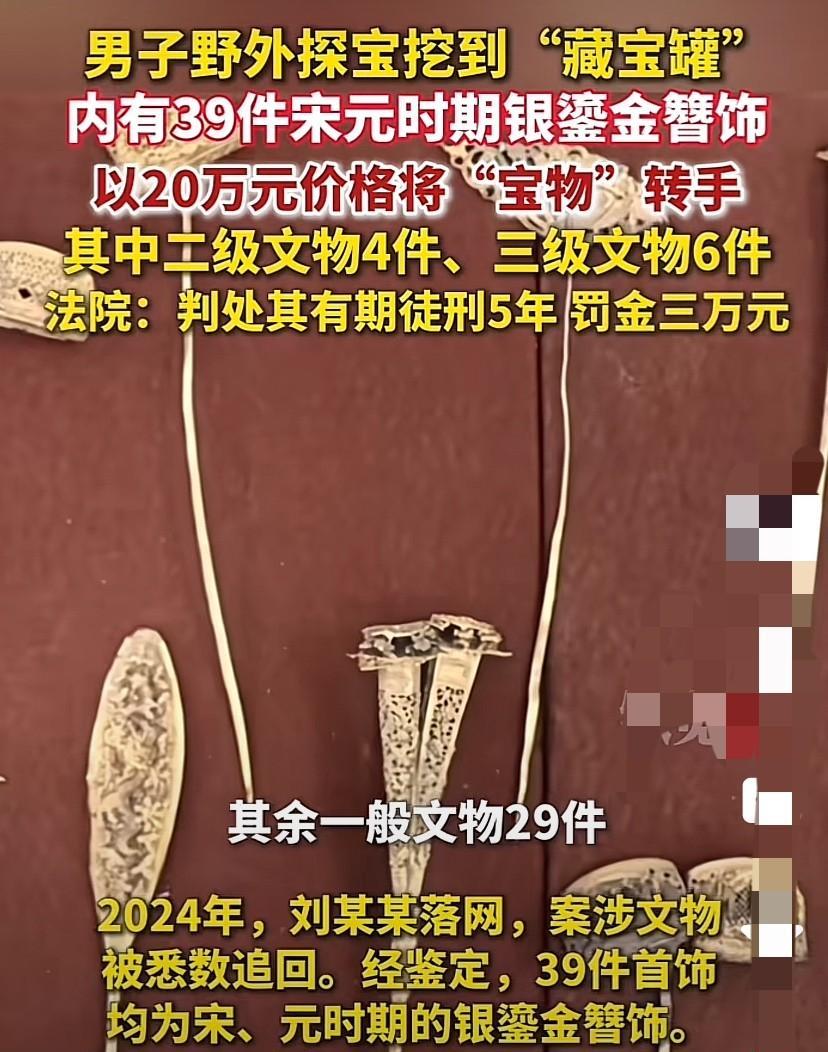 江苏,男子受探宝短视频“启发”,豪掷上千元买了个金属探测仪,随后还真找到了宝贝,一下子卖了20万元,一夜暴富。结果钱还没捂热,就被警方上门给抓了。最终一分钱没保住,还被判处有期徒刑5年,罚金3万元! 据悉,2023年初,男子刘某闲来无事在家刷短视频时,看到一条野外探宝的视频。 看到短视频中有人用金属探测仪在野外挖到宝贝,刘某怦然心动,暴富梦顿时也被点燃。 刘某当即便豪掷上千元网购了一个金属探测仪。 几天后,收到金属探测仪后,便迫不及待地在村口荒地探起了宝。 起初,刘某挖出来的还只是一些废铁残瓦,直到枯水季来临,前往村口附近的公园水库里碰运气,结果还真让刘某找到了个大宝贝。 据悉,刘某找到了一个布满青苔的陶罐,里面竟然装了39件金灿灿的首饰。 找到宝贝的刘某欣喜若狂,便拿着宝贝四处询价,最终在浙江一古玩市场内认识了一个二道贩子,沈某。 2023年8月,刘某在沈某的帮助下,以“出售家传宝贝”的名义,将挖到的宝贝以20万元打包卖给了浙江一买家王某,并给了沈某1.88万元好处费。 结果悲剧了,2024年2月,句容市警方根据线索将刘某抓获,沈某随后主动投案。 警方为什么抓刘某沈某二人? 1、《民法典》第253条的规定,法律规定属于国家所有的文物,属于国家所有。 《文物保护法》第5条规定,中华人民共和国境内地下、内水和领海中遗存的一切文物,以及中国管辖的其他海域内遗存的起源于中国的和起源国不明的文物,属于国家所有。 文物归国家所有,并不是无主物,也不是谁捡到就归谁。 2、《刑法》第328条规定,盗掘具有历史、艺术、科学价值的古文化遗址、古墓葬的,处3-10年有期徒刑,并处罚金;情节较轻的,处3年以下有期徒刑、拘役或者管制,并处罚金;有下列情形之一的,处10年以上有期徒刑或者无期徒刑,并处罚金或者没收财产: (一)盗掘确定为全国重点文物保护单位和省级文物保护单位的古文化遗址、古墓葬的; (二)盗掘古文化遗址、古墓葬集团的首要分子; (三)多次盗掘古文化遗址、古墓葬的; (四)盗掘古文化遗址、古墓葬,并盗窃珍贵文物或者造成珍贵文物严重破坏的。 可见,在古墓葬、古文化遗址挖掘文物属于犯罪行为! 3、《刑法》第326条规定,以牟利为目的,倒卖国家禁止经营的文物,情节严重的,处5年以下有期徒刑或者拘役,并处罚金;情节特别严重的,处5年以上10年以下有期徒刑,并处罚金。单位犯前款罪的,对单位判处罚金,并对其直接负责的主管人员和其他直接责任人员,依照前款的规定处罚。 可见,即便在普通地区挖掘文物虽然不构成盗掘古文化遗址、古墓葬罪,但是如果不上交国家,进行倒卖,同样会涉嫌犯罪。 而据悉,虽然刘某探宝的地点只是普通地点,而非古墓葬、古文化遗址,但经鉴定刘某所挖到的39件首饰均为宋、元时期的银鎏金簪饰,其中有二级文物4件、三级文物6件,其余29件银鎏金簪饰以及涉案陶罐为一般文物,又因刘某存在倒卖行为,故而警方才将刘某抓获。 另根据相关司法解释的规定,《刑法》第326条规定中的“情节严重”是指(一)倒卖三级文物的;(二)交易数额在五万元以上的;(三)其他情节严重的情形。 “情节特别严重”是指(一)倒卖二级以上文物的;(二)倒卖三级文物五件以上的;(三)交易数额在二十五万元以上的;(四)其他情节特别严重的情形。 可见,刘某倒卖文物的行为已经达到了犯罪的标准。 不过由于刘某到案后选择认罪认罚且积极退赃,最终被判处有期徒刑5年。 当然,沈某明知刘某倒卖文物而为刘某提供帮助,与刘某属于共同犯罪,最终也没逃脱处罚! 根据《刑法》27条的规定,在共同犯罪中起次要或者辅助作用的,是从犯。对于从犯,应当从轻、减轻处罚或者免除处罚。李某的丈夫相较于李某而言属于从犯,在量刑时应当从轻处理。 鉴于刘某到案后也选择认罪认罚、积极退赃,且相较于刘某属于从犯,法院最终判决沈某有期徒刑3年,缓刑4年,并处罚金1万元。 最后,刘某的案件令人唏嘘! 也再次提醒广大朋友们,野外探宝有风险,一定要提前做好功课,避免触碰法律底线!给自身带来不必要的麻烦! 这事您怎么看?欢迎在评论区留言,与大家一起交流您的看法! ------ 关注@安律说法 案例中看人生百态,法律中寻破局之法!#头号创作者激励计划#