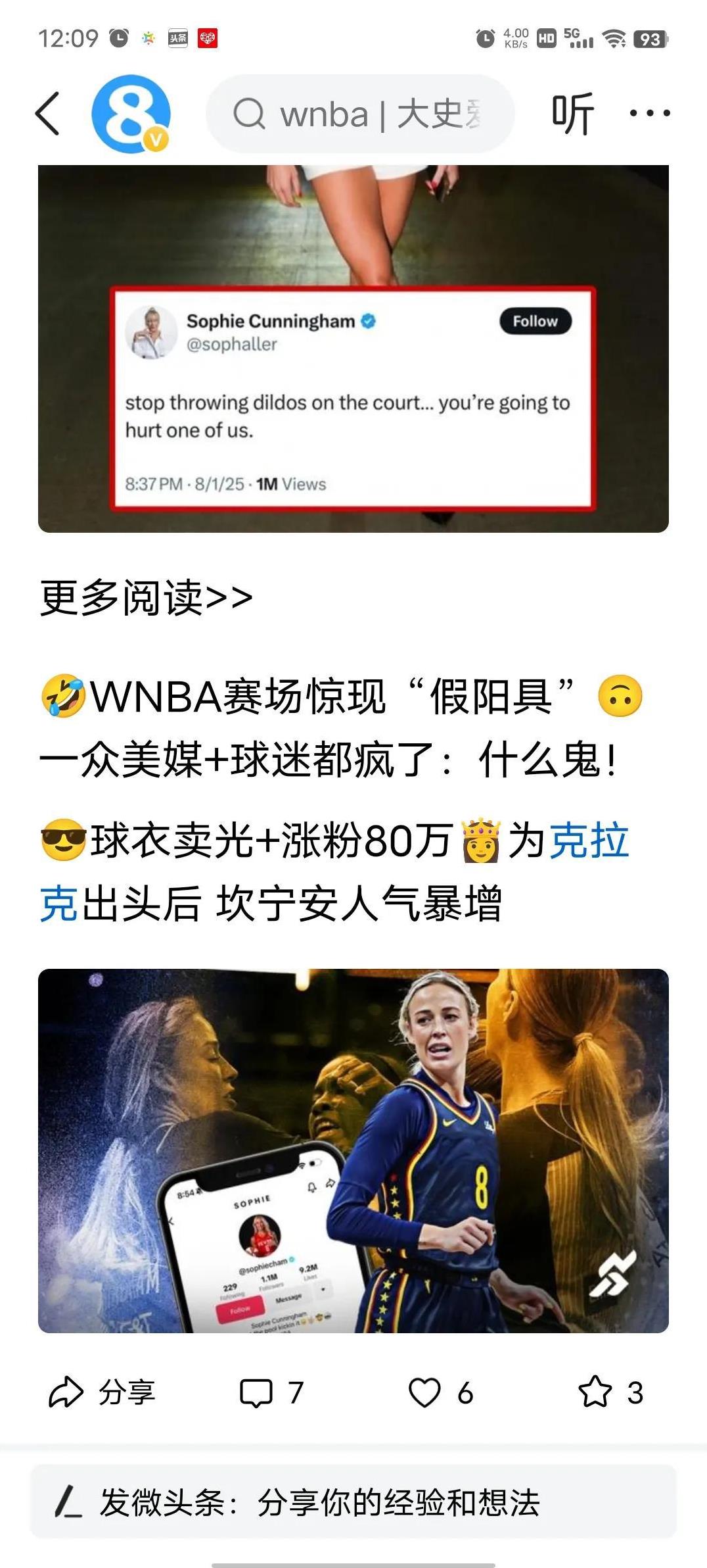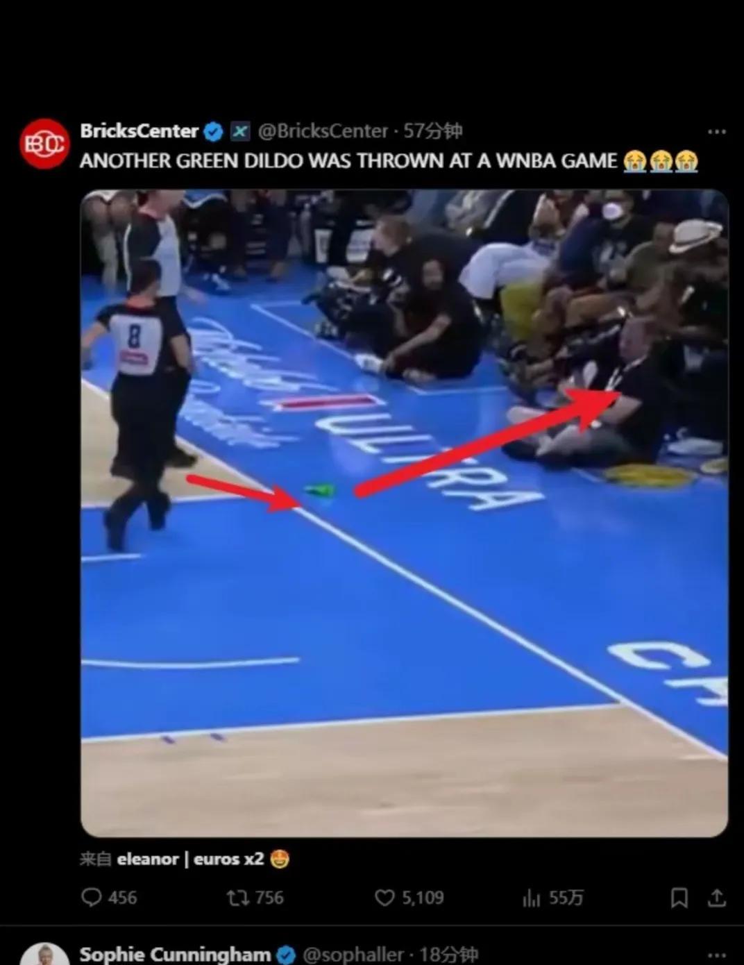 性激素的刺激还是暗讽女子赛场有变性人!WNBA女篮比赛场地内惊现阳具,不知道是哪个球迷扔出去的!太离谱了[捂脸][捂脸] 该事件发生在8月2日的金州女武神和芝加哥天空的一场比赛进行期间,且是再次扔出,女裁判不得不中断比赛把这个绿色假玩意儿踢出场外。 索菲坎宁安在推特发文呼吁:请不要往赛场上扔假阳具,这会伤害到我们。她的仗义执言让自己瞬间涨粉80万!可见这事儿在美媒和球迷之间引起轰动! 实在是想不通,这个球迷这么做的原因是啥?意淫还是暗讽场上队员里有男人?[笑哭][笑哭]大家觉得呢?