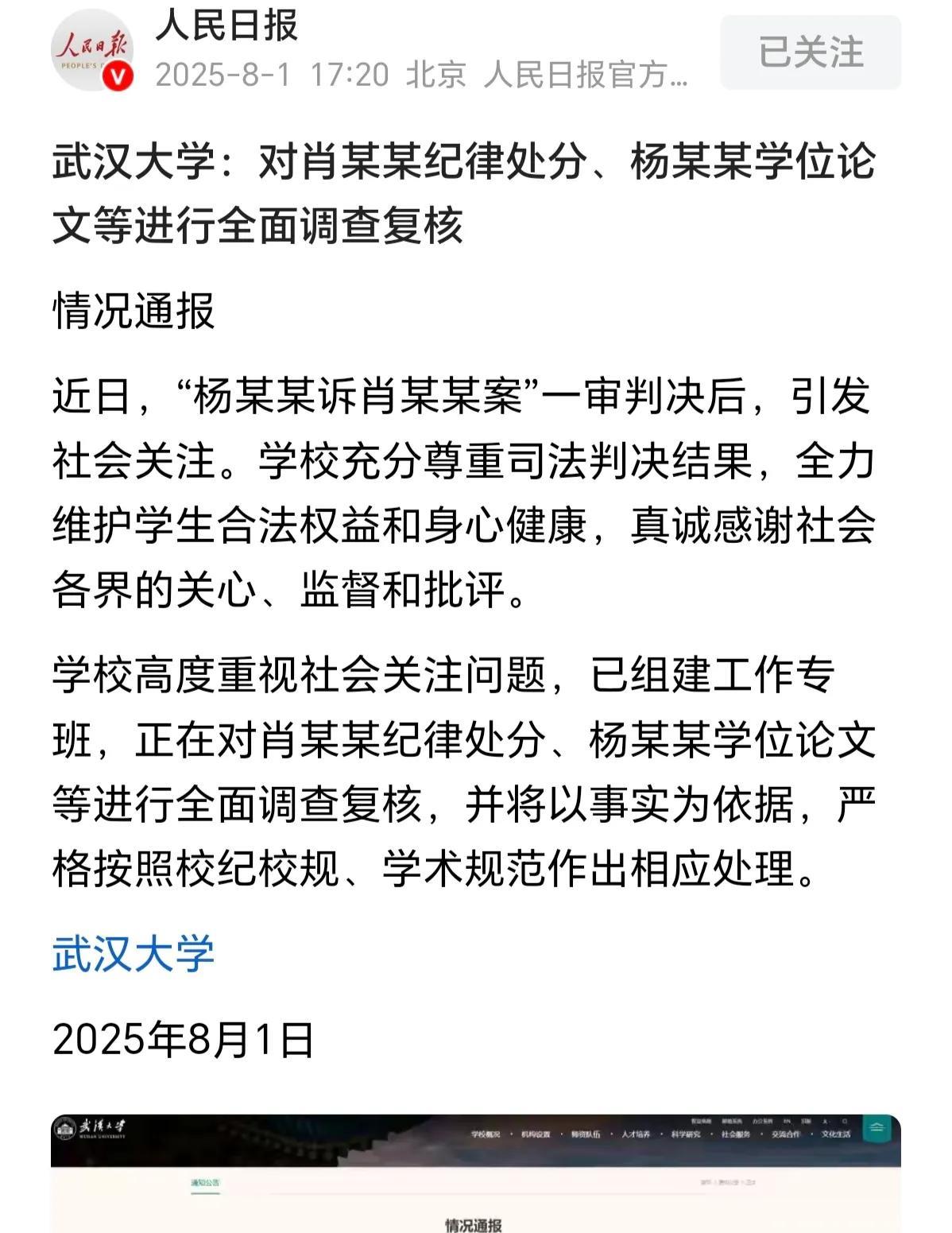 武大终于回应老百姓期待,表示复查肖某处分和杨某学位论文。 法院一审判决一出,群情