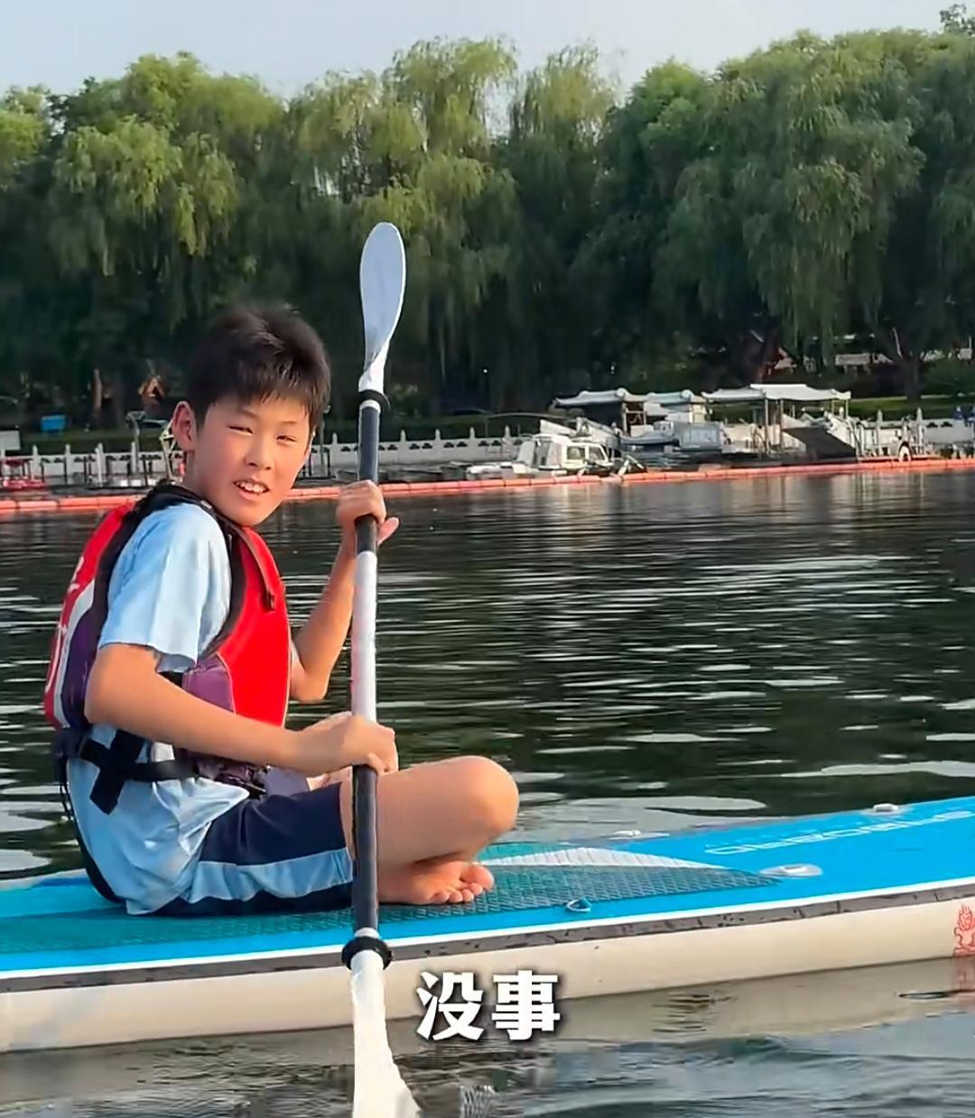 黄征和13岁儿子在北京划桨板,儿子身高已经和他差不多,但长相不如他,鼻子不太好看