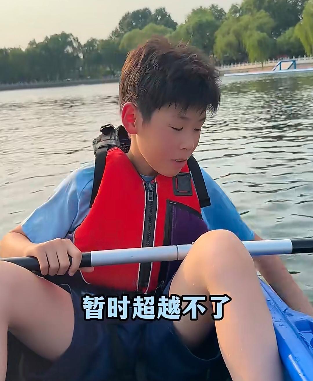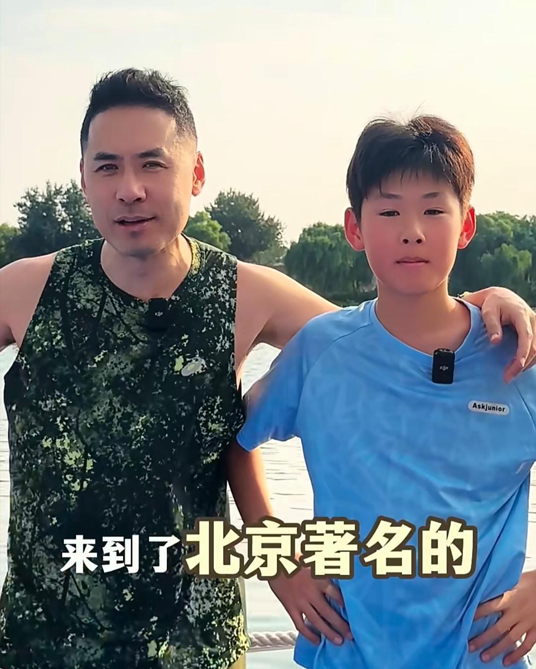 黄征和13岁儿子在北京划桨板,儿子身高已经和他差不多,但长相不如他,鼻子不太好看,颜值非常一般。