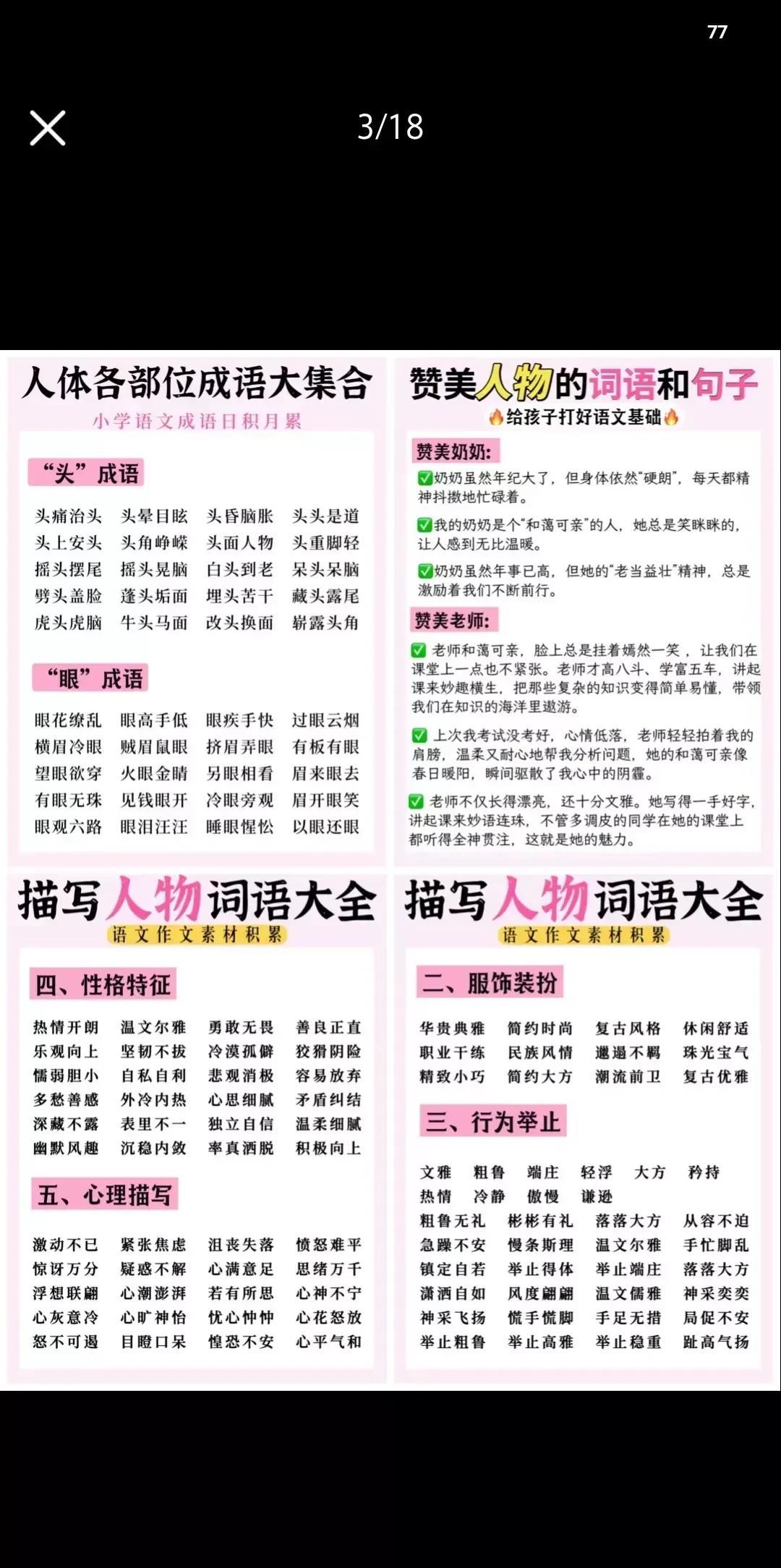 小学语文有个不成文的潜规则,就是基础不牢地动山摇!小学语文字词成语全都在这18张纸上了!让孩子把它倒背如流了,你会发现,原来孩子把语文的基础打好也可以这么简单!背下这些成语大全,增强记忆力,锻炼孩子大脑快速记忆能力! 就拿赞美人物的内容来说,这里面有丰富的词语和句子。比如赞美妈妈时,有“温柔婉约”“勤劳朴实”等词语,还有生动的句子“妈妈温柔婉约,笑起来像春天盛开的花朵,好看极了”。孩子在学习这些内容时,不仅能积累词汇,还能学会如何用恰当的语言去赞美他人,提升表达能力。 再看描写夏天的比喻句,像“夏天的树叶像一片绿色的海洋,郁郁葱葱,枝繁叶茂”,这样的句子充满了想象力和画面感。孩子背诵这些句子,能增强对语言的感知能力,在自己写作时也能运用比喻的手法,让文章更加生动有趣。 劳动相关的成语分类也很细致,有劳动精神、劳动辛苦、劳动成果等类别。比如“兢兢业业”“任劳任怨”等成语,孩子在记忆这些成语的同时,也能理解不同的劳动品质和状态,这对他们的认知和写作都有很大帮助。 人体各部位的成语和量词分类也不容忽视。“头头是道”“眼花缭乱”等成语,以及“个、只、头”等量词,都是语文学习中的基础内容。孩子掌握这些,能在日常表达和写作中更准确地运用词汇,避免出现用词不当的问题。 让孩子把这 18 张纸上的内容背下来,让孩子把语文的基础打好,也可以变得这么简单!以往,孩子面对海量的字词成语,可能会感到无从下手,记忆起来也十分吃力。但有了这 18 张纸,就像有了一份清晰的学习地图。 孩子可以按照纸张上的分类和顺序,有条不紊地进行记忆。比如先集中攻克易错字,通过反复书写和辨析,加深对字形的记忆;再背诵成语,结合成语故事理解其含义和用法。这种系统化的学习方式,大大提高了学习效率,让孩子在轻松愉快的氛围中掌握语文基础知识。 背下这些字词成语大全,不仅仅是为了应对考试,更重要的是能增强孩子的记忆力,锻炼孩子大脑快速记忆能力。大脑就像一台精密的机器,越使用越灵活。当孩子努力背诵成语时,他们的大脑在不断地进行信息的输入、存储和提取。 这个过程就像是在给大脑做一场“健身运动”,让大脑的神经细胞更加活跃,连接更加紧密。例如,孩子在背诵“守株待兔”这个成语时,不仅要记住四个字的写法,还要理解农夫因为一次偶然得到兔子就放弃劳作,最终一无所获的故事。 以及这个成语所讽刺的靠侥幸心理获得成功的错误想法。在这个过程中,孩子的视觉记忆、听觉记忆和逻辑记忆都得到了锻炼。随着背诵的成语越来越多,孩子的大脑就像一个不断扩容的仓库,能够快速准确地存储和调用各种信息。 而且,当孩子熟练掌握了这些字词成语后,他们在阅读文章时就能更加顺畅地理解文意。遇到生僻字词,能凭借平时的积累准确认读和理解;看到精彩的成语,能立刻领会作者的用意,感受语言的魅力。在写作时,也能运用丰富的词汇和恰当的成语,让文章更加生动有趣、富有文采。 小学语文的基础务必要打好,语文是所有学科的基础,语文学不好,基础不扎实,会影响语文阅读理解,甚至影响语数英物化生政史地等其他学科的审题,审题审不好,题目就做不对,题目做不对就拿不到分数,考试拿不到分数如何升学,如何考大学,大学考不上,如何找到好工作? 所以说基础不牢地动山摇,趁着孩子读小学,要重视孩子的学习,把基础打打扎实,家长保存收藏给孩子看一看学一学,让孩子用心去背诵、去理解,家长们可以引导孩子去学习和背诵,结合课堂笔记多练一练,写一写,让孩子在积累中提升语文能力,基础打扎实了,考试就不愁了! 斗半匠2025新版课堂笔记1-6年级上册语数英人教北师苏教同步教材