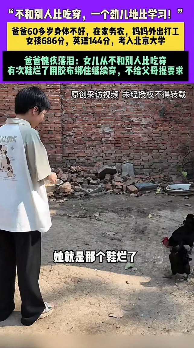 看哭了!河南驻马店,爸爸60多岁身体不好,在家务农,妈妈外出打工,女孩没有参加一次课外辅导,却以686分的高分考入北京大学!爸爸愧疚落泪:女儿从来不和别人比吃穿,有次鞋烂了她不让我们买,用胶布绑住继续穿……而女孩的一句话令人泪目!