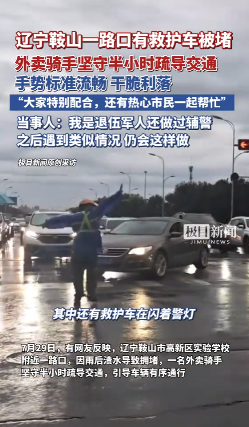“必须嘉奖!”7月29日,辽宁鞍山,一外卖小哥送饭途中,发现救护车被堵,他赶紧将电车放在路边,前去疏导交通,手势标准流畅,干脆利落,之后,更是在雨中坚守半小时,小哥直言:我是退伍军人,还做过辅警!网友:退伍不褪色!