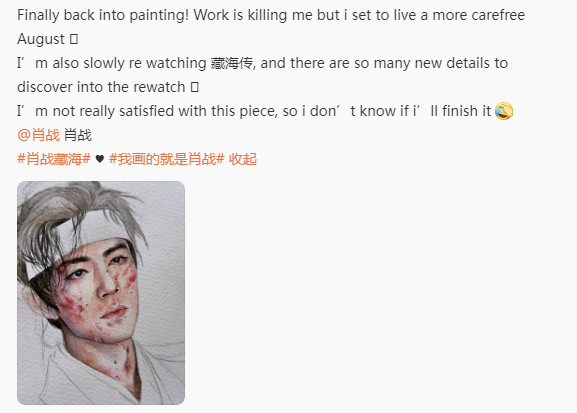 饭随偶像肖战,才华横溢。近日,看到一位肖战海外粉丝画的脸上染血的藏海,美得惊为天人。衣服,头发线条并不复杂,但面部轮廓,眉眼逼真传神,眼中泪光莹然,把藏海的坚毅又破碎的美感描画的跃然而出,简直神作!