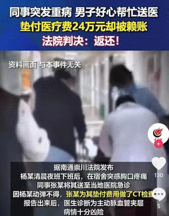 在南通一个寻常的夜晚,刚下夜班的杨某身体突然垮了,胸口剧痛、冷汗直流,瞬间命悬一线。这是医学上极为凶险的主动脉夹层。就在其他同事手足无措时,平日里与杨某关系不错的张某站了出来。他没多想第一时间开车把杨某送到医院,又当机立断安排救护车紧急转往医疗条件更好的大医院。