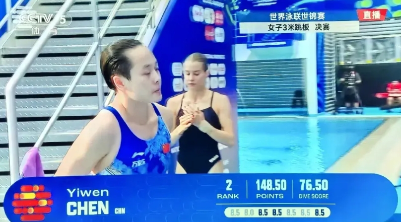 我们是冠军。女子三米板决赛开始了,半决赛当中,陈一文,陈佳分获第一第二名,这和昨