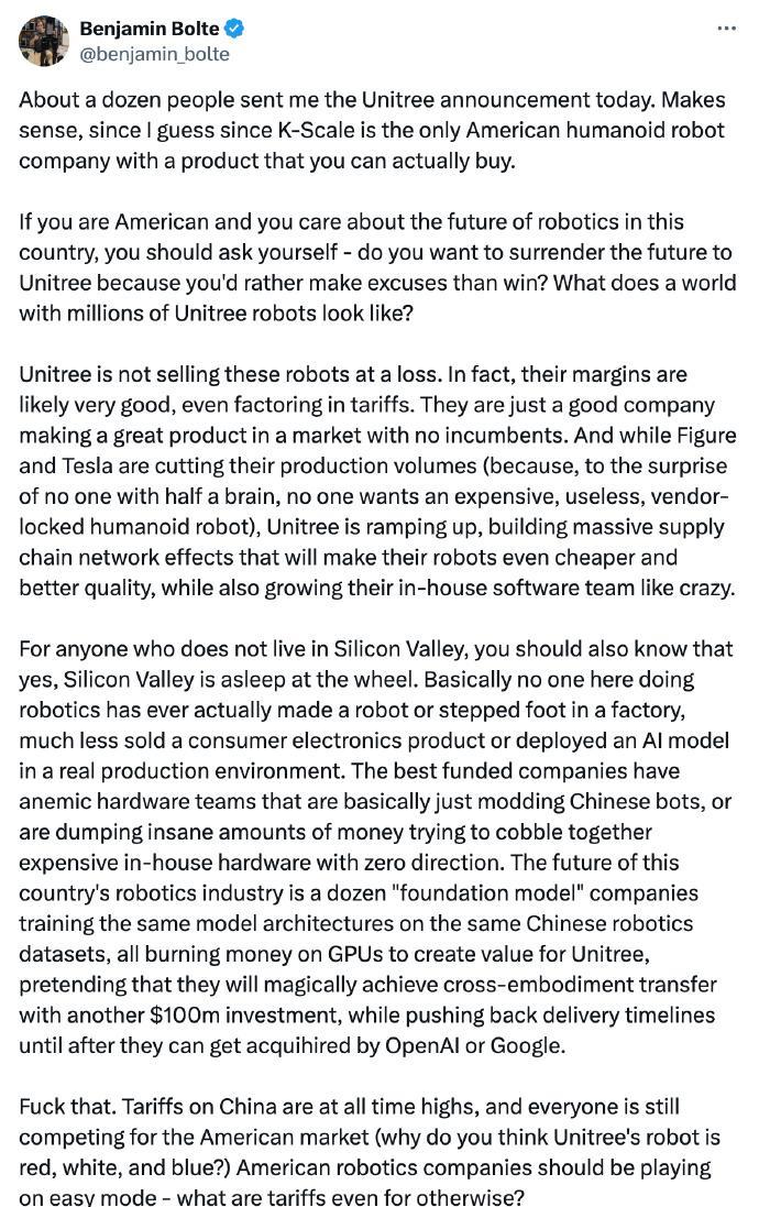 来,感受一下美国前端科技工程师对美国工业现状的绝望和愤怒,以及对中国同行的羡慕和尊重。 前段时间,宇树科技发布了一款4万块钱的人形机器人R1,功能强大且先进,价格便宜,关注机器人行业的人都大受震撼。下图是美国一家人形机器人公司的创始人,对宇树科技、中美人形机器人产业的评价。 他说,硅谷搞机器人的一帮人没造过真机器人、没下过工厂、没卖过电子产品、也没真的部署过AI模型,要么抄中国同行的作业,要么瞎砸钱,都太水了。这一群“大模型”公司,烧着同样的钱、训着差不多的模型(用的可能还是中国数据),然后幻想等哪天被OpenAI或谷歌收购。 与此同时,宇树在美国卖机器人是真赚钱,他的产品好、受欢迎,而且人家还在疯狂扩张建供应链、招人搞软件,建立机器人生态。哪怕美国现在对中国的关税很高,宇树照样能打进美国市场,还能赚钱。 字里行间,话里话外,都能感受到美国这位机器人行业的从业者,对老美机器人行业的绝望,对同行的不满和愤怒,还有对宇树、以及中国机器人产业的羡慕和尊重。 这也是现在美国科技创新的一个缩影,搞金融赚钱太简单了,就没人想吃苦搞创新了,都在吃老本,玩左脚踩右脚,期待被大企业投资,然后原地升天。 越是在前端的,会越绝望,因为看不到一丁点改变现状的机会和可能性。