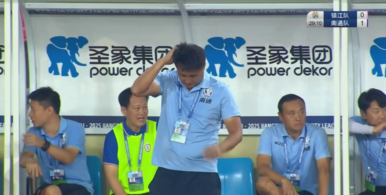 镇江队主教练稳如泰山,南通队主教练焦急万分,不停的来回走动,抓头。 怎么回事呢?