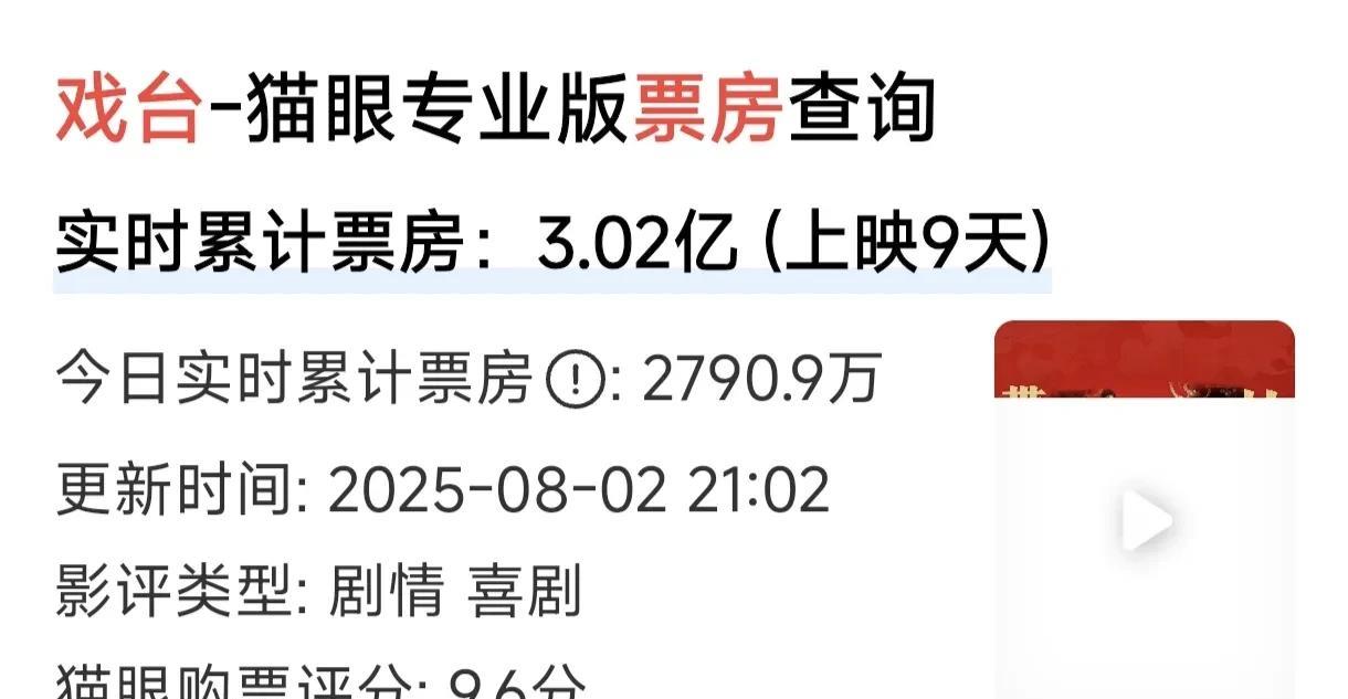#电影戏台#《戏台》票房破3亿了!陈佩斯不忘老粉丝推出银发专场!恭喜《戏台》票房破3亿!猫眼:8月2日晚上21点,《戏台》票房3.02亿元。 陈佩斯执导、参演的《戏台》票房有后劲,这个后劲就是陈佩斯老艺术家的老粉丝50后、60后、70后这三代国人。陈佩斯也不忘老粉丝,推出10元银发专场“8月4日起,每天10点后,60岁以上老人及其陪人员票价10元”。 网友:陈佩斯不忘初心!