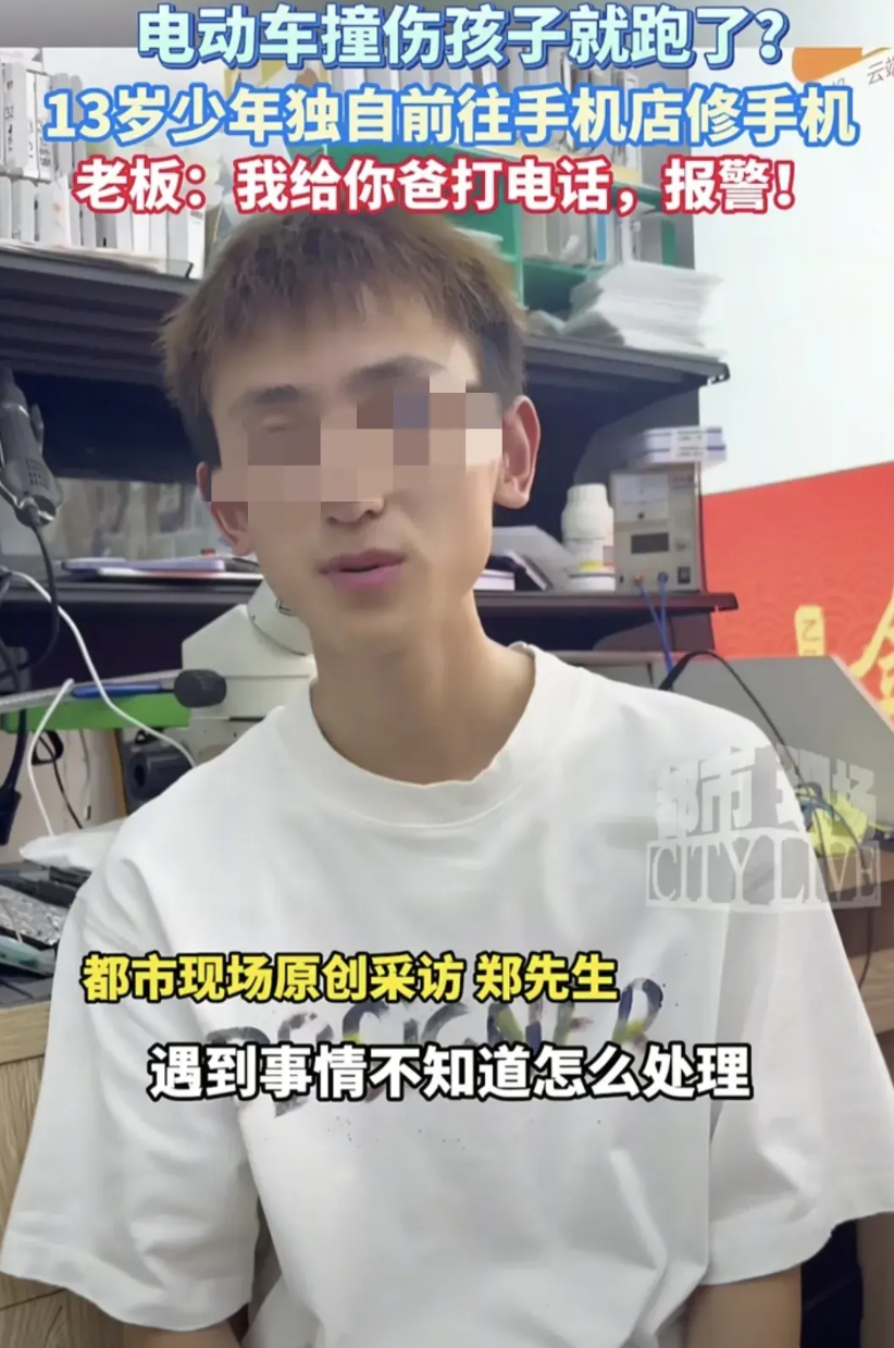 手机店老板郑先生在得知男孩被电瓶车撞了又逃跑的事后,不仅主动关心男孩伤势,还联系男孩家长并提醒报警。