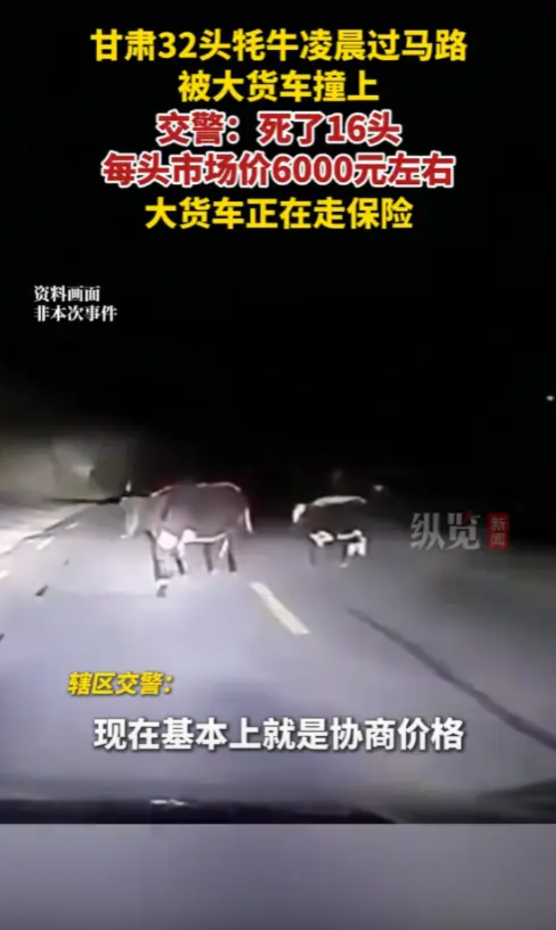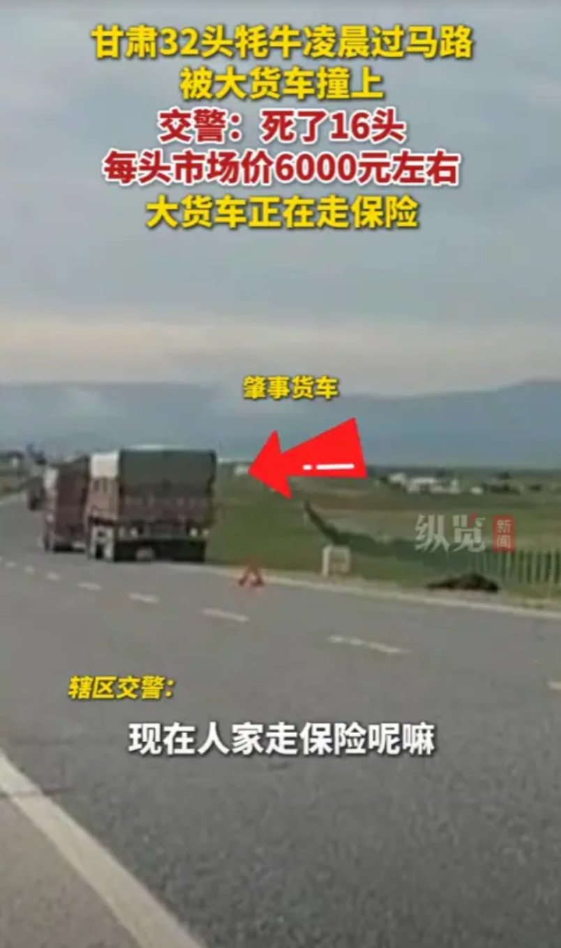 “天塌了!”8月1日,甘肃,一货车司机凌晨赶路途中,没有看清牧民放的黑牦牛,一下子撞了上去,32头,死了16头,按照市场价,一头要6000元!交警直言:正在协商价格,死牛就归牛主人了!网友:算是良心价了。