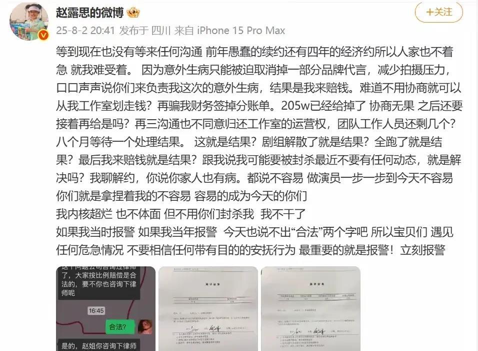 赵露思又出来喊冤了。一篇小作文诉说自己的委屈,无奈和流量。 很多人都让赵露思单干,可是单干哪里那么容易,天价违约金,谁赔的起,除非她的粉丝都有钱,能一票一票把自己的爱豆赎回来。其实正常的解约,赔违约金就可以啊,但是她没有那么多钱,就想利用舆论拉着无脑的粉丝跟公司对干,想违约还不肯赔钱的意思。 其实大家看戏要看全面,人家公司也没错,收入按照分成比例拿的,赔钱的时候当然就要按照分成比例去赔啊。谁拿的多当然就是谁赔的多。不是说你生病就有道理的,而且感觉这种病不是有钱人都生不起。穷人有几个有这种病的,还是钱多烧的,