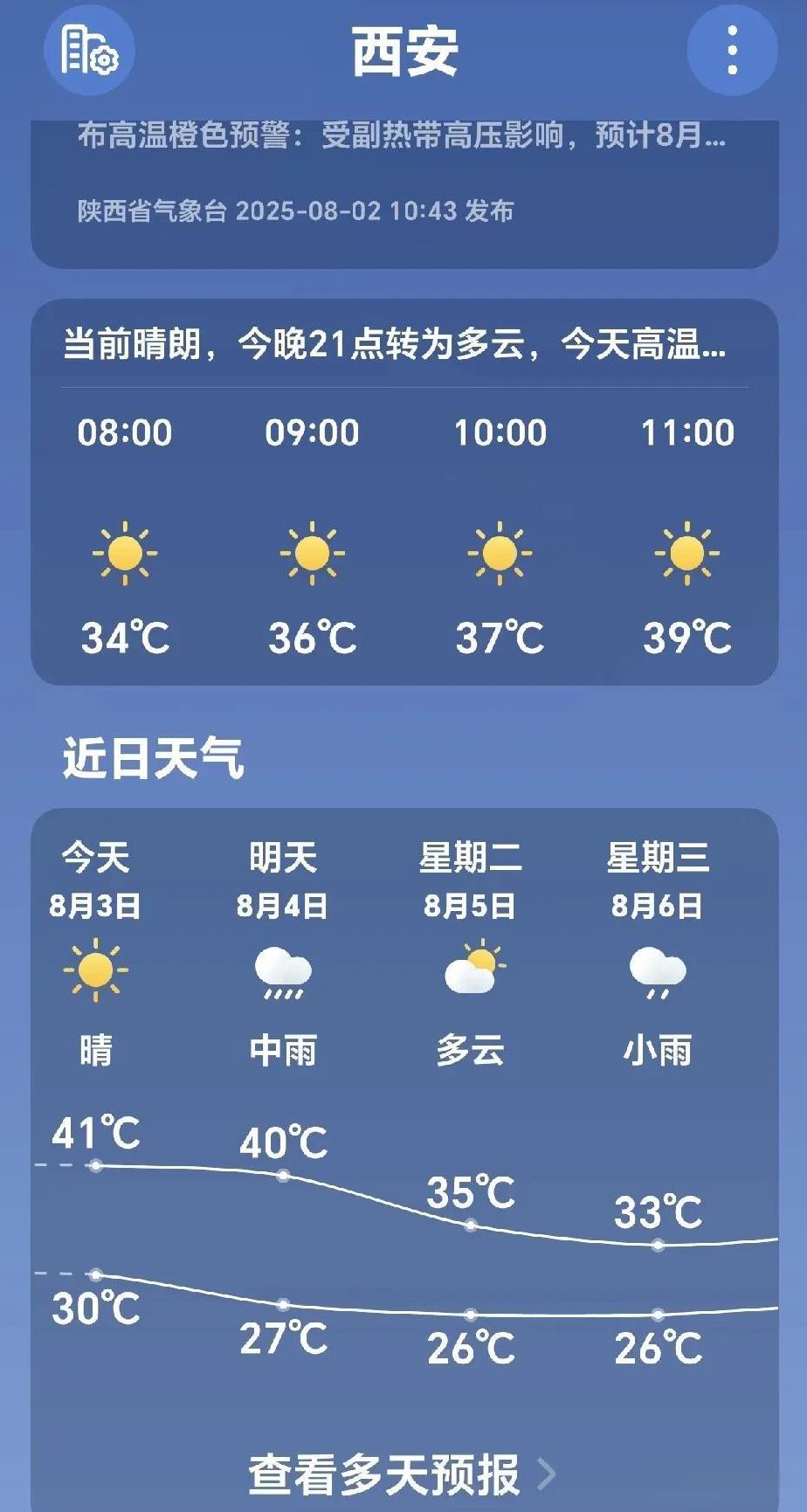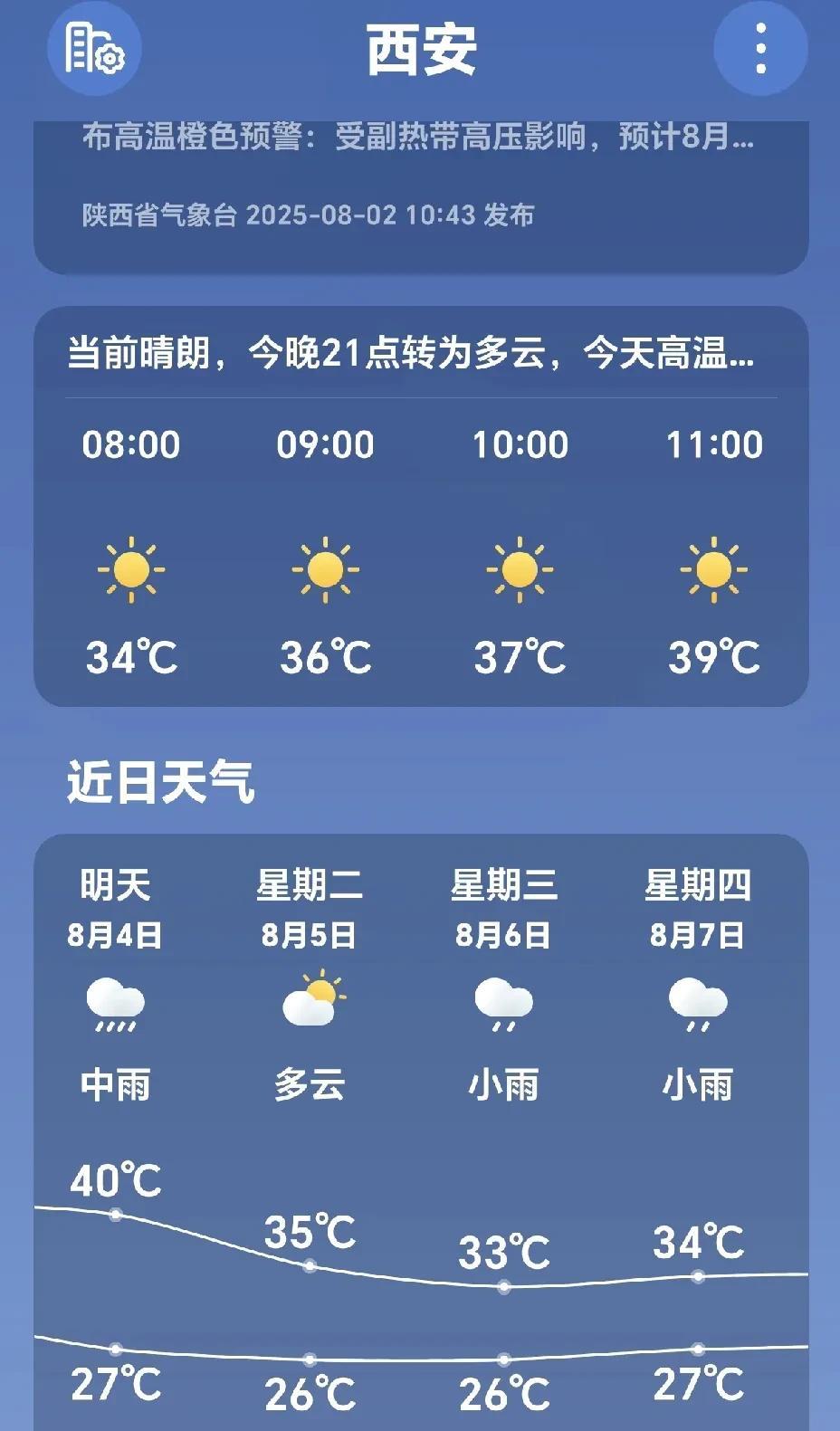 西安人今天再坚持一天,从明天开始中雨,天气一下子就凉快了! 刚看天气预报,从明天开始西安降温了,直到8月6号立秋前,一直是小雨,最高气温下降到33℃,最低气温下降到26℃。起码一天之内24小时有凉快的时候了,不像这一段时间全天候的热。对这样的天气,大家是不是很期待? #头号创作者激励计划#