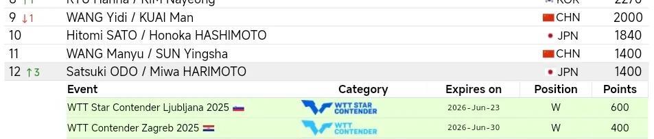 张本美和/大藤沙月配合参赛四站四冠,夺冠率100% 在#WTT伊瓜苏球星挑战赛# 女双决赛,日本组合张本美和/大藤沙月以大比分3比0战胜了韩国组合金娜英/柳韩娜夺冠! 这也是张本美和与大藤沙月配合参赛以来的第四个女双冠军,两人自6月的卢布尔雅那球星挑战赛开始配合参赛,首次参赛即夺冠,之后又在萨格勒布常规挑战赛收获第二个女双冠军,上周的布宜诺斯艾利斯常规赛收获第三个女双冠军,本站张本美和/大藤沙月又战胜了上周的拉各斯常规赛女双冠军金娜英/柳韩娜,份量还是有的! 在收获四个女双冠军之后,张本美和/大藤沙月的世界排名将上升至第9,蹿升相当快,未来很可能成为国乒女双劲敌,毕竟两人都非常年轻,还可配合很多年! #头号创作者激励计划#