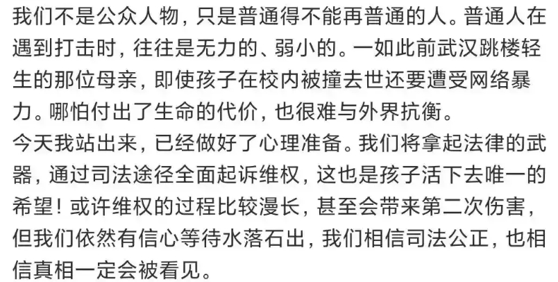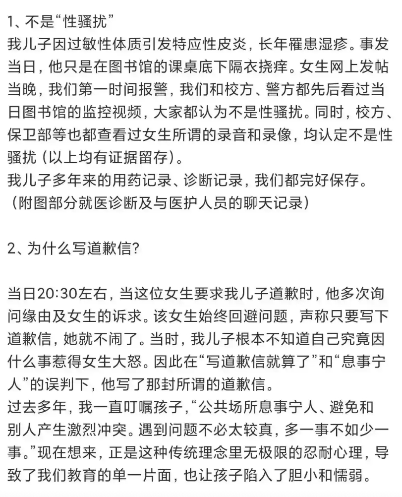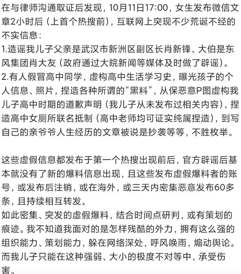 武汉“性骚扰”案中的男生肖某妈妈出来发声了,针对网络上的质疑声,妈妈写了一篇20