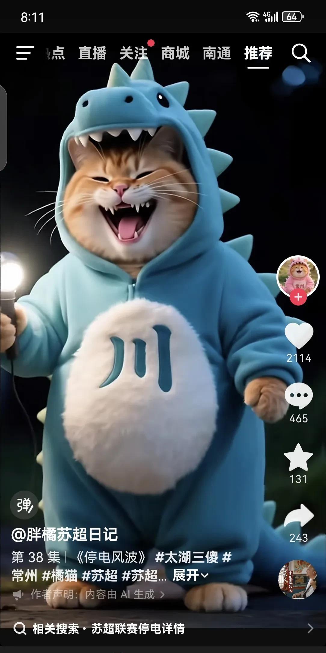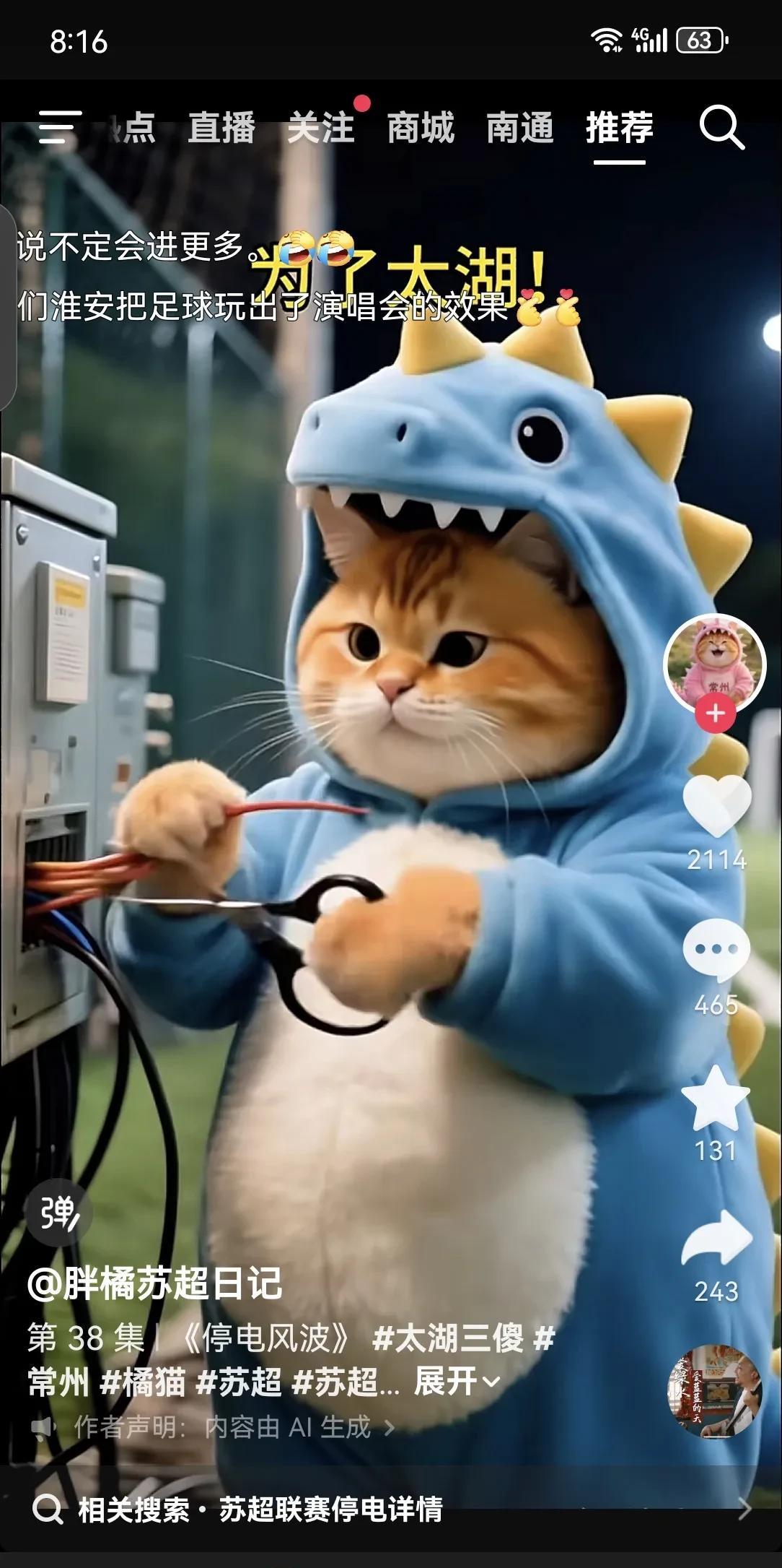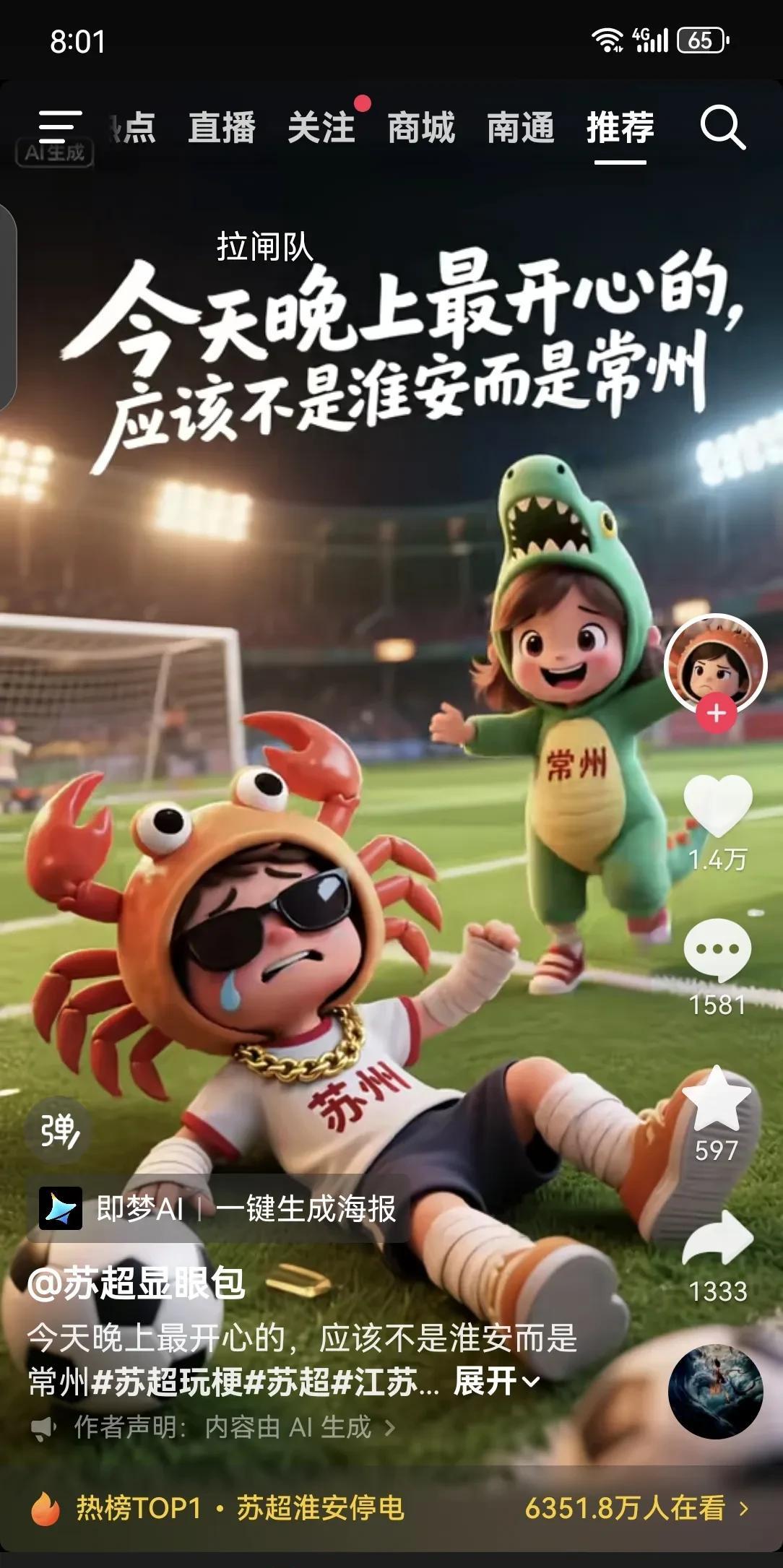 苏超比国足更有“看点”何止是“梗”,还有各式各样的玩偶就能把你笑疯了。昨晚上淮安队对阵苏州队时闹出更大笑话。在淮安队1:0时,赛场突然断电,一时陷入僵局。还好抢修及时,电力部门主动道歉。 一觉醒来,再上抖音已经有人把停电当作“乌龙事件”编成玩偶发在网上,再配上调皮儿歌简直把整个赛场当成游乐场耍了,停电是赛场上1:0时开始的,结束时踢到3:0,爱调侃的人认为是故意停电,所以被戏称为“乌龙”! 从玩偶设计上可以看出:先是“浪里马”登场亮像,后来就是苏州队类似猫科动物登场,其中还有阳澄湖大闸蟹等玩偶轮番上场。最后苏州队把“州”三点水输了,只剩下“川”字了。 这就是苏超玩梗的高明之处。