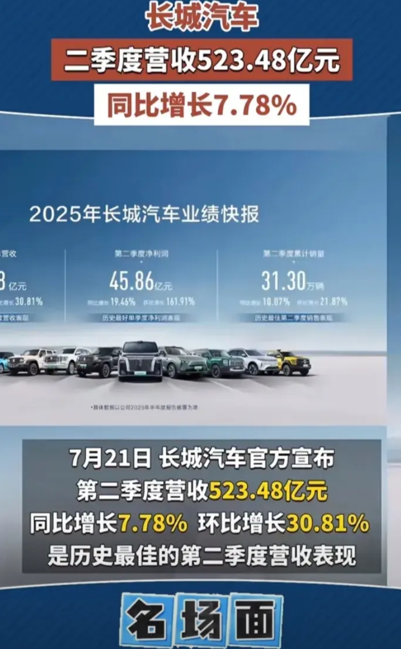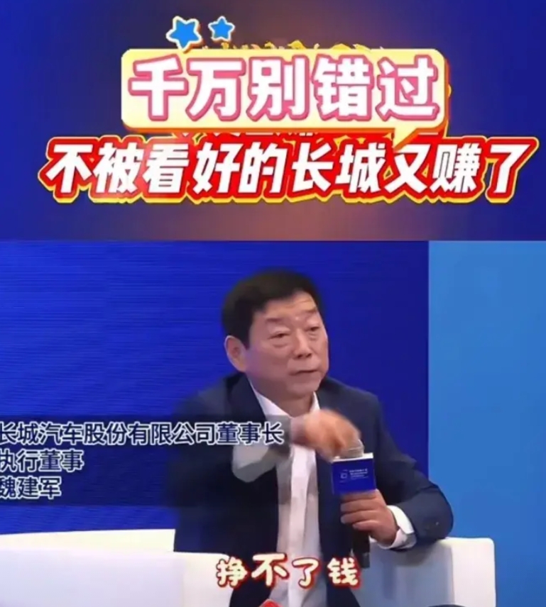 魏建军又跑出来说大实话!还别说这次被他说中了! 老魏说:我要是挣不了钱,全中国的车企都挣不了钱!长城汽车销量不是第一,是谁给老魏的勇气,说这么有底气的话。大家可能还不知道?长城汽车虽然卖不过比亚迪,吉利和上汽集团。可是单车利润是最高的,一台车的纯利润可以做到12800元。相当于差不多比赛力斯的6900元的两倍。 2025年上半年的长城汽车的营业额是923.67亿元,比2024年上半年的880.47亿元,足足高出1.03%。利润63.37亿元,再说长城汽车每年还放10天高温假期,还有哪位友商有这么好的福利,我想长城汽车单车利润最高也有长城8.2万员工的辛勤付出吧!