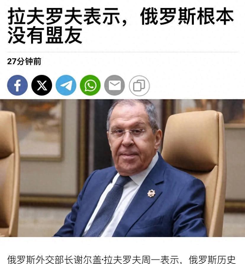 拉夫罗夫:“俄罗斯历史上第一次孤军奋战,对抗整个西方世界。第一次世界大战和第二次世界大战期间,我们都有盟友。现在,我们在战场上没有盟友,这意味着我们必须完全依靠自己。” 麻烦看官老爷们右上角点击一下“关注”,方便您进行讨论和分享,感谢您的支持! 一战时期,那时候的俄国帝国和英法结成了联盟。这个联盟其实是个务实的选择,毕竟共同的敌人是德国。当时德国处在地理上的中心位置,东边盯着俄国,西边攻打法国,同时还对英国的殖民地虎视眈眈。 各国在面对德国的威胁时,短暂放下彼此之间的矛盾,结成同盟。虽然这联盟并非完全基于信任,但至少彼此间的合作让俄国不至于孤立无援。 到了二战,情况则更加复杂和严峻。苏联成为打击纳粹德国的主战场,承受了沉重的战争压力。 这一次,苏联不仅在军事上抗击德国,还得到了美国、英国等国的大量物资援助。飞机、坦克、食物和弹药通过租借法案源源不断地输送到苏联。 这种全球范围内的统一战线让俄罗斯有了强大的外部支撑,形成了坚实的盟友体系。二战期间,俄罗斯不仅是孤胆英雄,更是强大联盟的一员。 而当我们把目光转向当前的俄乌冲突时,俄罗斯的处境就显得格外孤单。首先,俄罗斯是这场冲突的主动挑衅者,而不是受侵略的一方。这个身份转变让国际社会对俄罗斯普遍持批评态度,绝大多数国家不愿意公开支持俄罗斯。 再加上今天的国际环境和过去大不相同。全球化让各国之间经济联系密切,形成了利益交织的网络,简单的“我们对他们”的二元对立难以成立。 以印度为例,这个国家既从俄罗斯进口大量石油,又保持与美国等西方国家的良好关系。印度不愿意在这场冲突中站队,而是更倾向于保持平衡,体现出现代国际关系的复杂性。 而且,这场冲突的目标没有像二战那样明确。二战的目标是打败法西斯,维护全球和平,几乎得到全世界的共识。 现在俄罗斯提出的“去军事化”、“去纳粹化”等口号,许多国家看起来更像是借口,难以认同。目标模糊让其他国家无法形成统一战线去支持俄罗斯。 而且,俄罗斯虽然得到了一些非传统盟友的有限支持,比如中国持“劝和促谈”的中立态度,伊朗等国提供经济支持,但这些远不能构成军事和政治上的坚实后盾。整体来看,俄罗斯确实是陷入了被孤立的局面。 以往俄罗斯总能凭借强大的军事实力和地缘优势,拉拢盟友形成对抗阵营。但这次,它必须几乎完全靠自己,面对来自西方的重重压力。 传统的结盟方式在当代显得越来越难以复制,经济全球化和多极化的国际格局让简单的军事联盟不再是国家间唯一甚至是首选的合作方式。国家之间更多靠经济利益、外交平衡和软实力博弈,而非纯粹的军事同盟。 对于俄罗斯来说,缺乏真正的盟友意味着它在战略上将更加被动。没有外部支援,资源消耗巨大,国际压力巨大,长期孤立还可能导致经济和社会的内耗。 我们可以进一步分析,为什么这次俄罗斯没能获得像一战、二战那样的盟友支持。 俄罗斯的主动挑衅角色使得它在国际道义上的形象受损,很多国家更倾向于支持乌克兰。 当今的国际环境中,没有一个单一的“敌人”,也没有像德国那样威胁到整个欧洲的安全和秩序。大国间更多是利益纠缠和复杂的地缘政治考量,难以形成统一战线。 另外,美国和其盟友的影响力依然强大,他们在国际组织和金融体系中占据主导地位,能够通过经济制裁和外交压力孤立俄罗斯。同时,中国、印度等国虽然不愿得罪俄罗斯,但也不会公开站队,这样的“模糊态度”加剧了俄罗斯的孤立。