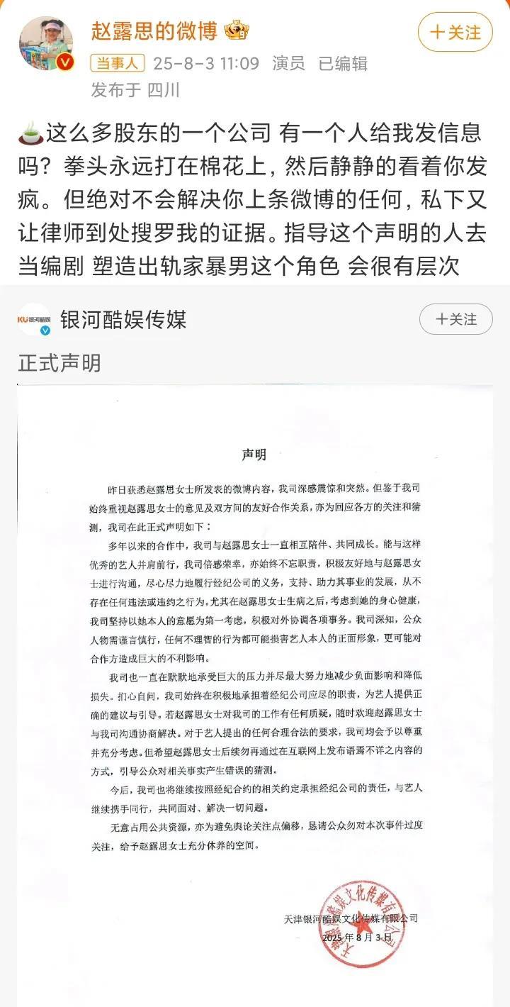 感觉赵露思疯了,她居然用轻生威胁银河酷娱低成本解约。 银河酷娱发布声明后,赵露思