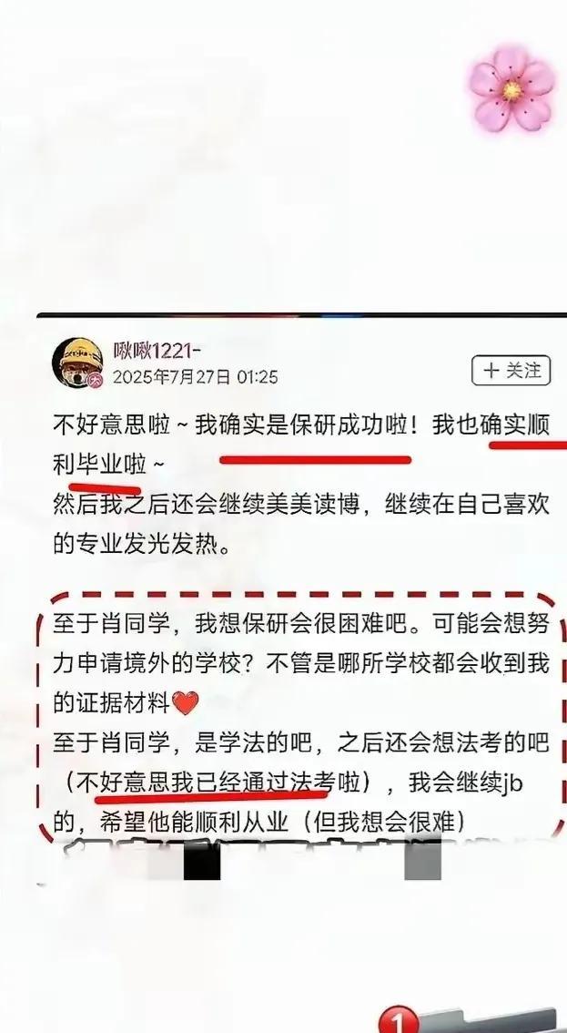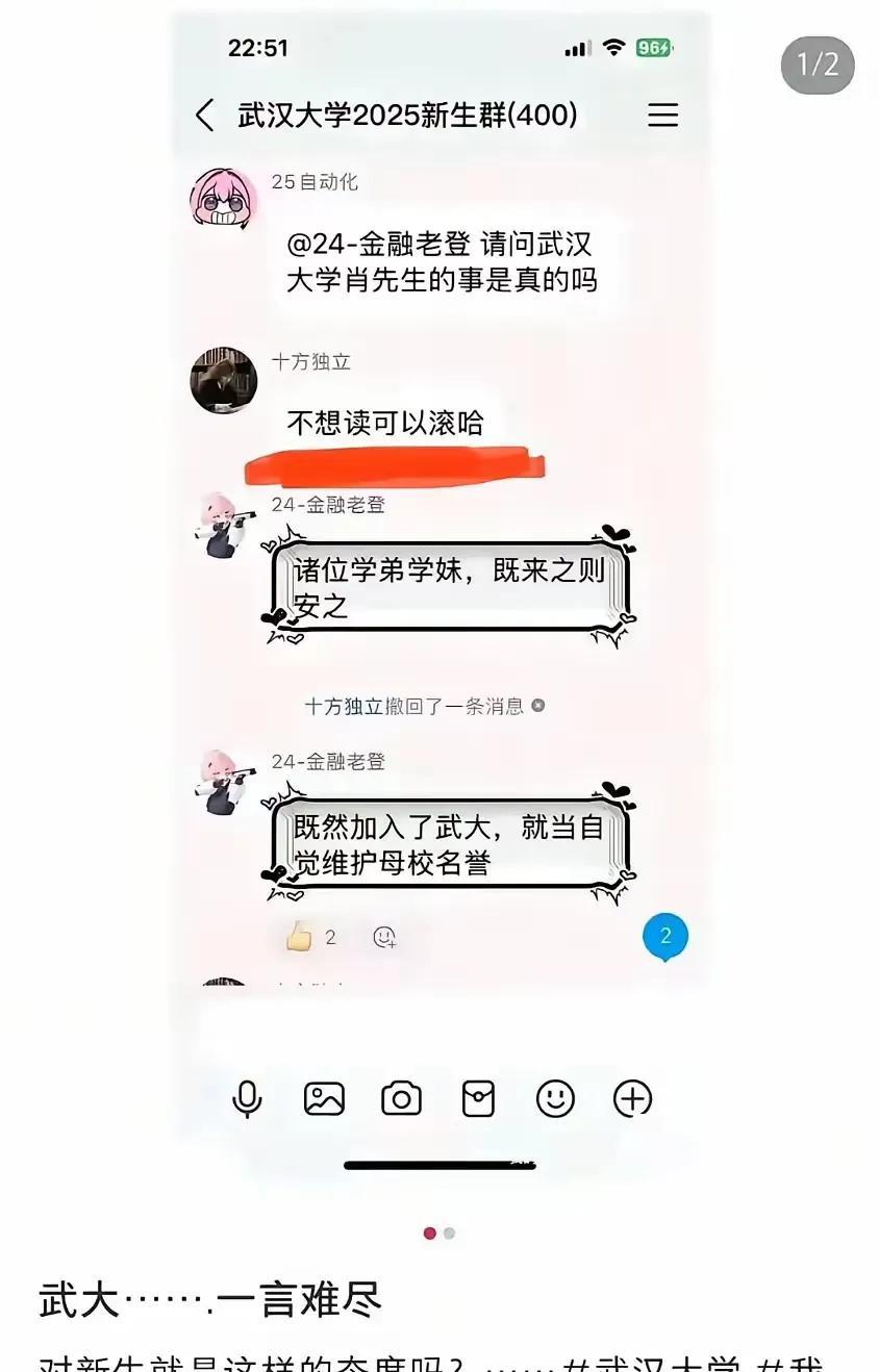 因为图书馆“性骚扰”事件,武汉大学一举成名了,武大为了学校的荣誉禁止学生讨论此事件,可笑的是事情发展到了今天,还能堵住悠悠众口吗?央媒都发声了,话说回来,事情发展到了无法掌控的地步谁的错?本来一件小事,校方完全可以自行调节,根据是非对错公平公正的处理,可就是校方助力作为,单方面给予肖同学留校察看处分 + 学业中止的处分,杨同学才会肆无忌惮,毫无底线的欺压肖同学,让事件升级,舆论扩大,学校声誉才会因此受到影响。 感谢网络,肖同学的事件才能面世,不然肖同学或许已经成为了牺牲品,遭受网暴,学业终止,甚至活不下去,她人却踩着受害者高声炫耀,我毕业了,保研了,肖同学很难从业吧……好,这下好了,我们期待这样的女人她的人生能走到一个怎样的高度,相信自此以后,她身边人男同胞都会有所警惕,万一哪天不小心,被控诉性骚扰,被不依不饶的网暴,人家可是学法的,远离为妙!