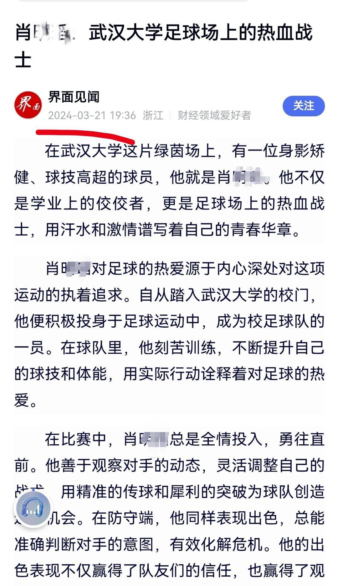 肖同学家竟然可以调动多家媒体对他进行全方位的赞扬报道。我说诸位网友,你们有谁被哪怕一家官媒报道过吗?我随手就找到2024年4月份《新闻晨报》、《界面界闻》对他的报道,也就是说,图书馆事件后的半年多,官媒还在吹捧他,不是说抑郁症要自杀吗?怎么公益做的飞起,足球场上激情四射呢? 为肖某做抑郁症诊断的医院,你们敢出来走两步吗?