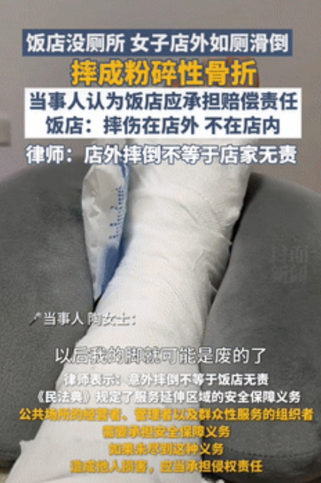 就在这时,有律师给出了自己的看法。他认为,顾客之所以会走到店外那个位置,根本原因在于餐馆没能提供厕所这一基本服务设施,并且店员的“指引”行为,也让餐馆和这起意外产生了直接的关联。从这个角度看,即使摔倒在店外,餐馆也难以完全撇清关系,需要承担一定的责任。