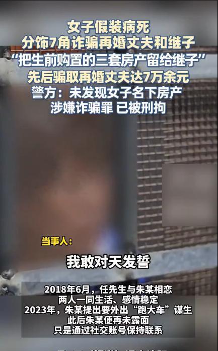 “电视剧都不敢这么演!”辽宁沈阳,一女子和再婚丈夫生活了5年,随后她外出打工再也没有露过面。一天,女子突然告诉丈夫自己快要死了,想把名下的3套房子送给他,于是丈夫就和相关人员对接,可花了7万多却始终没收到过户的消息,意识到被骗就报了警,没想到,这些“工作人员”都是女子假扮的,而且女子还和别的男人结了婚! 2018年6月,朱某和任先生重组了家庭,两人和任先生的孩子生活在一起,生活也逐渐有了起色。 后来,朱某接触到了赌博,最终越陷越深,欠了一屁股债,2023年年初,朱某在网上认识了家在农村的陈某,为了躲债,朱某谋生了一个大胆的想法。 几个月后,她告诉任先生自己要去外面“跑大车”赚钱,随后便消失了,只是偶尔和任先生聊聊天,其实朱某是去找了陈某,不久后,二人就登记结婚。 此后,朱某为了赚快钱,竟打算利用任先生对自己的信任,骗他一笔钱财。 2024年3月,朱某告诉任先生自己得了绝症,快要死了,打算把名下的房产过户给他,但是房子还没有交房,还有一些手续需要办,于是就推了几个人给任先生交接。 没想到,这7个人全部都是朱某扮演的,她一点点的榨取任先生的钱财。 最终任先生察觉到不对劲,赶紧报了警,警方顺利将朱某逮捕归案。 可直到最后,任先生都不愿相信自己被朱某骗了! 大家对于这件事是怎么看? 信息来源:《女子假装病死分饰7角诈骗再婚丈夫》映象网