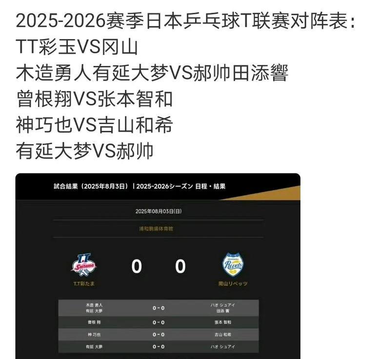 张本智和也在打T联赛。 看到郝帅和张本智和都是冈山俱乐部的,他们和TT彩玉的对阵表出来了,郝帅打男双的比赛,还有一场男单。今天看到张本智和的赛前训练图,这次的新发型看起来不错,有点可爱啦,张本智和的球迷还是很多的,在训练馆里张本智和又收到好多礼物。看到他们打T联赛的比赛服都挺好看的,马上要比赛了,看到郝帅、张本智和都穿上粉色比赛服了。 张本智和入场时,跟现场的球迷打招呼了,看到有网友说:“白桃粉颜色的比赛服好看,张本智和像邻家乖乖小孩儿”。日本的T联赛,早田希娜、平野美宇、木原美悠都参赛,张本美和、大藤沙月、桥本等在打球星挑战赛挣积分了。 昨天的日本T联赛,林昀儒、松岛辉空、闫安所在的木下东京俱乐部取得了首胜,看到大家在一起的氛围也很好,林昀儒的教练也跟着在现场指导了。